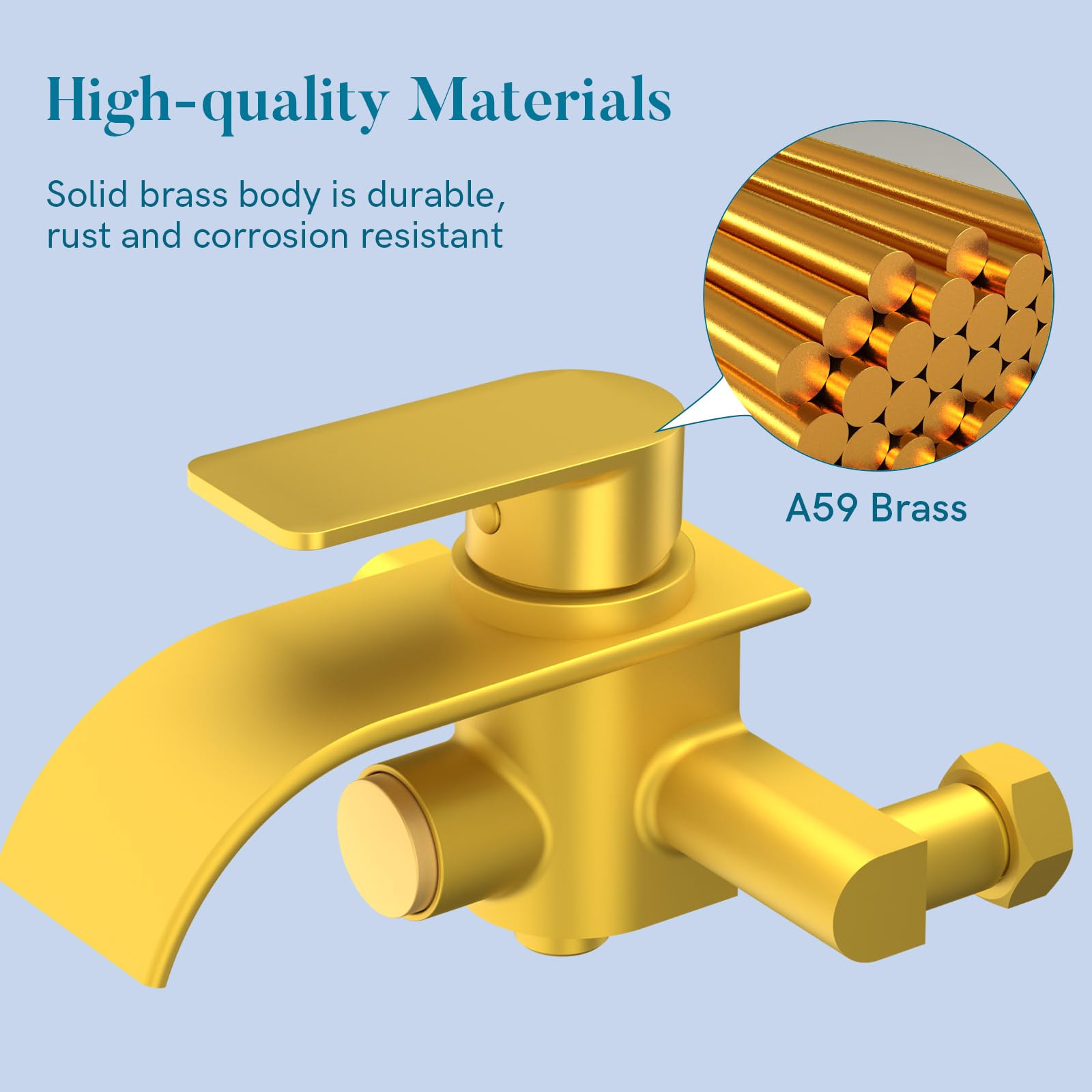 ["๐ฟ WATERFALL BATHTUB FAUCET - The bathtub faucet features a waterfall spout design that provides a larger water outlet area, quickly filling the bathtub and avoiding temperature drop after a long wait. The water from this tub faucet is soft, smooth, splash-free, and noiseless, allowing you to enjoy a wonderful shower experience.","๐ฟ UNIQUE PRESSURE BUTTON DESIGN - The bathtub mixer tap has a unique patented pressure button design for switching the water outlet mode, which is more convenient than the traditional pull-up design and can avoid abnormal water flow. At the same time, button operation enhances the switching experience and adds fun to shower time.","๐ฟ HIGH-QUALITY CRAFTSMANSHIP - The main body of the bathtub faucet is made of high-quality A59 brass and manufactured using gravity casting, which is high-temperature resistant, corrosion-resistant, and rust-resistant. The surface of the bathtub faucet has been galvanized with 10 layers of chrome to ensure long-lasting shine, stain and scratch resistance, and easy cleaning.","๐ฟ EASY TO USE - KULACO single handle bathtub mixer, simply turn the handle to easily select hot and cold water, making it a breeze to control water temperature and flow. Our waterfall bathtub faucet has a built-in high-quality ceramic valve core that has been tested 1,000,000 times, working drip-free, quietly, and stably.","๐ฟ EASY INSTALLATION - The bathroom shower faucet complies with the European installation standard G 1/2" connection and comes with installation accessories and instructions, allowing even novices to install it themselves. (Tips: Please confirm before purchasing whether the installation size is appropriate: Installation hole spacing: 150 ยฑ 15 mm)."]