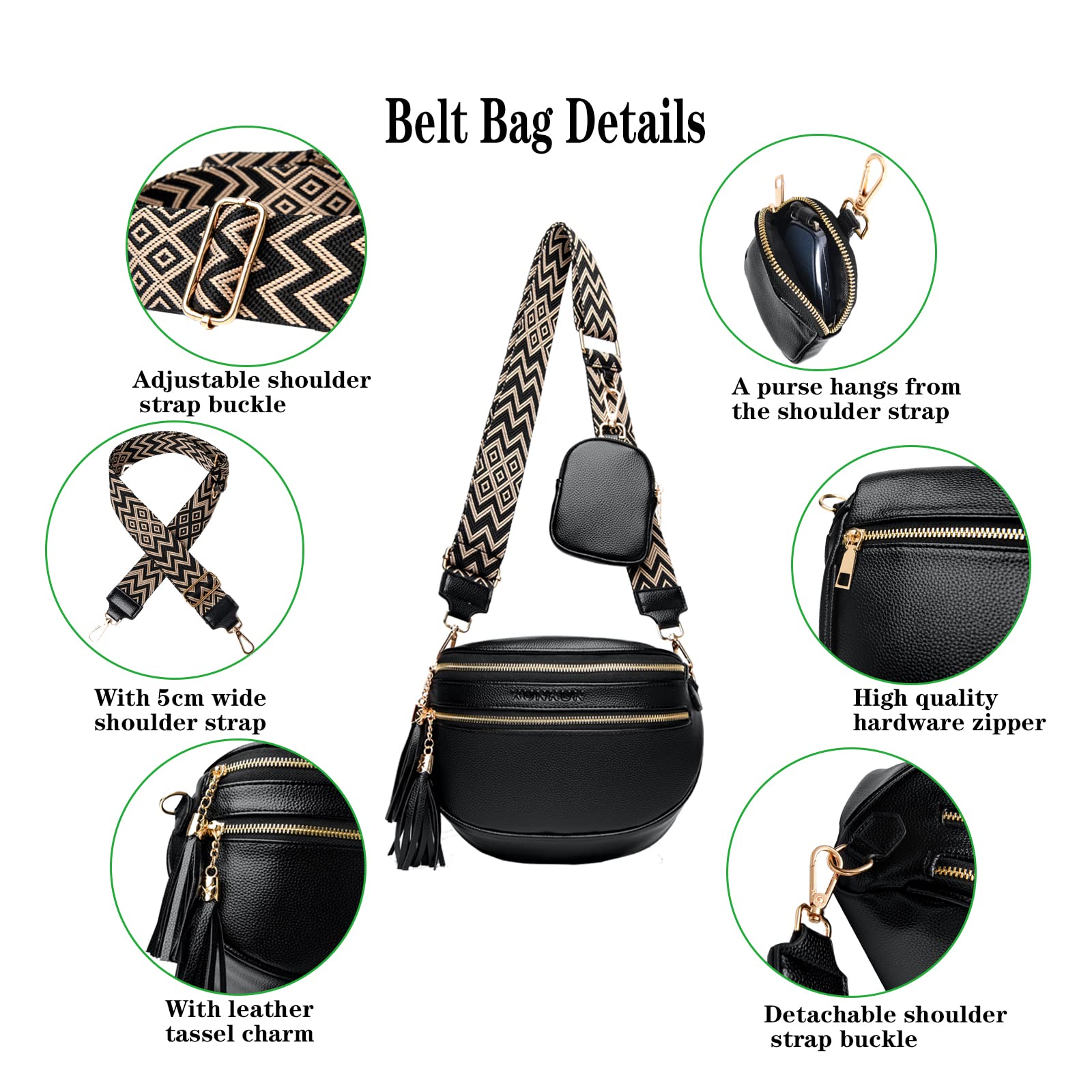 ["❤️ Stylishe Bauchtasche für Damen: Aus hochwertigem Kunstleder. Leicht und weich mit mehreren Taschen und goldenen Hardware-Quasten am Schieber.","❤️ Größe: 27 cm x 11 cm x 22 cm, mit abnehmbarem Schultergurt. Reißverschluss aus Qualitätslegierung, Länge 70-130 cm, für die meisten Erwachsenen geeignet.","❤️ Fassungsvermögen: 4 Fächer, ideal für Geldbörse, Make-up, Handy, Schlüssel usw. Vielseitig einsetzbar als Gürteltasche, Brusttasche oder Umhängetasche.","❤️ Verschiedene Stile: Tolles Geschenk für besondere Anlässe. Kundenservice: Wir sind für Sie da! Produkte mit hoher Qualität und schnellem Support.","❤️ Kundenservice: Respekt und Dankbarkeit für Ihre Zufriedenheit. Hochwertige Produkte und nachhaltige Erfahrung. Bei Fragen kontaktieren Sie uns per E-Mail." ]