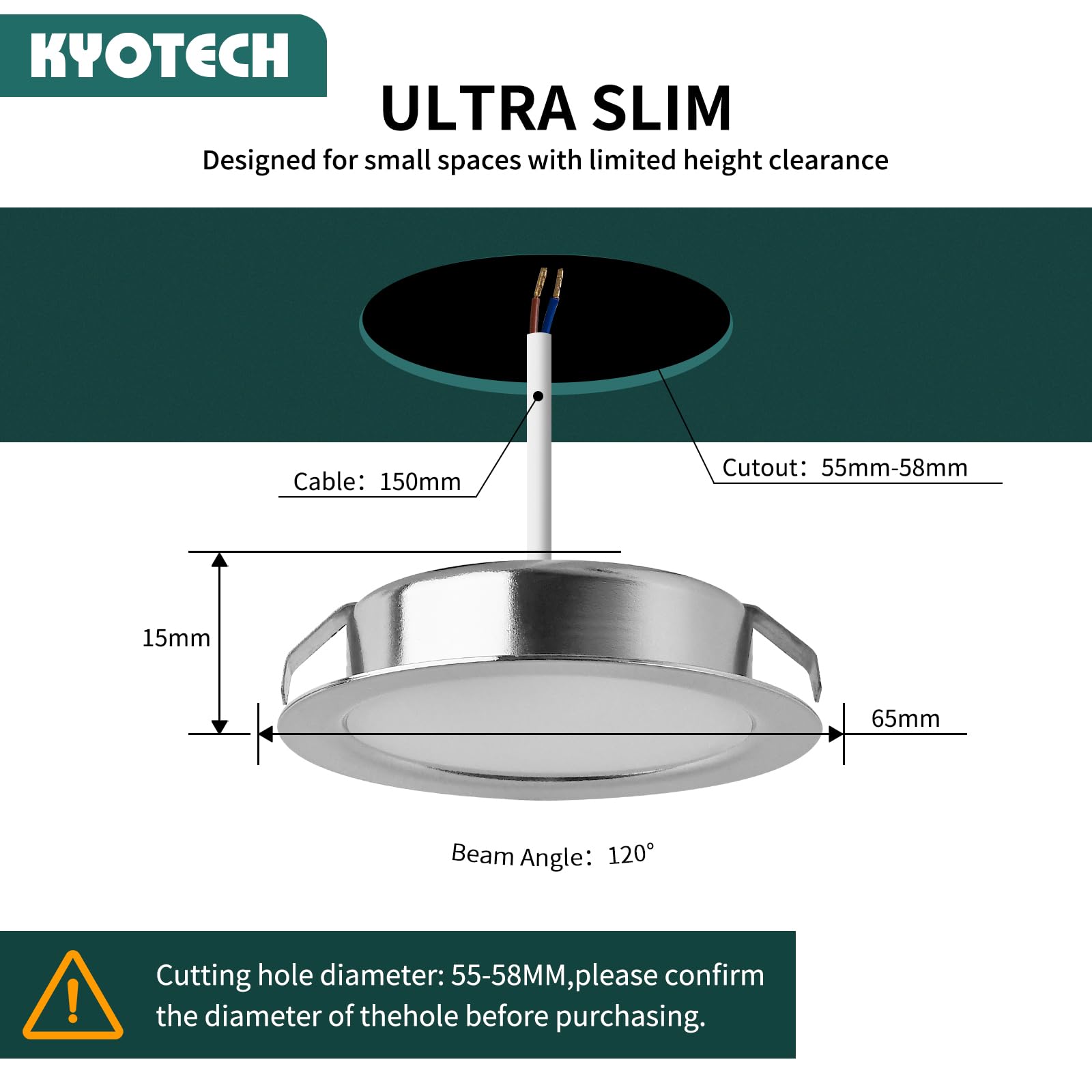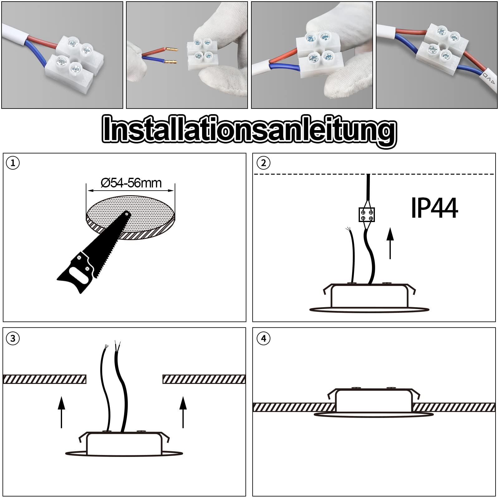 ["Easy to install】Cutout 55-58mm (ceiling thickness greater than or equal to 5mm), outer diameter 65mm, installation depth 20mm, 14cm connection cable. 20mm Flat furniture recessed spotlight Ultra-flat design, better suited for small spaces. No transformer needed, connect with 230V cable and push the LED furniture light into the hole.","【3 Color Temperatures】 LED flat recessed spotlight 230V 4W. You can change the desired color temperature with a normal switch, press once for 3000K, twice for 4000K, and three times for 6000K. Recessed lights do not have a memory function","【Ultra Flat - Mini LED Recessed Spotlight】The recessed spotlights are made of plastic in chrome housing color. Furthermore, the voltage is 230V (LED AC 230 Volts - transformer unnecessary), light output 300 lumens, power 4W, protection class IP44, beam angle 120°, and the color rendering index is >80 Ra","【Energy Saving and Environmental Protection】4W LED module (non-replaceable permanently installed), it can replace the traditional 25W halogen lamp and is more energy efficient. 20000 hours lifespan.","【Wide Range of Applications】IP44 LED furniture recessed spotlight to replace traditional halogen G4 lights, suitable for kitchen hood light, bathroom recessed spotlight, bedroom, furniture cabinets, wardrobes, showcases, mirror cabinets, shelves, and much more."]