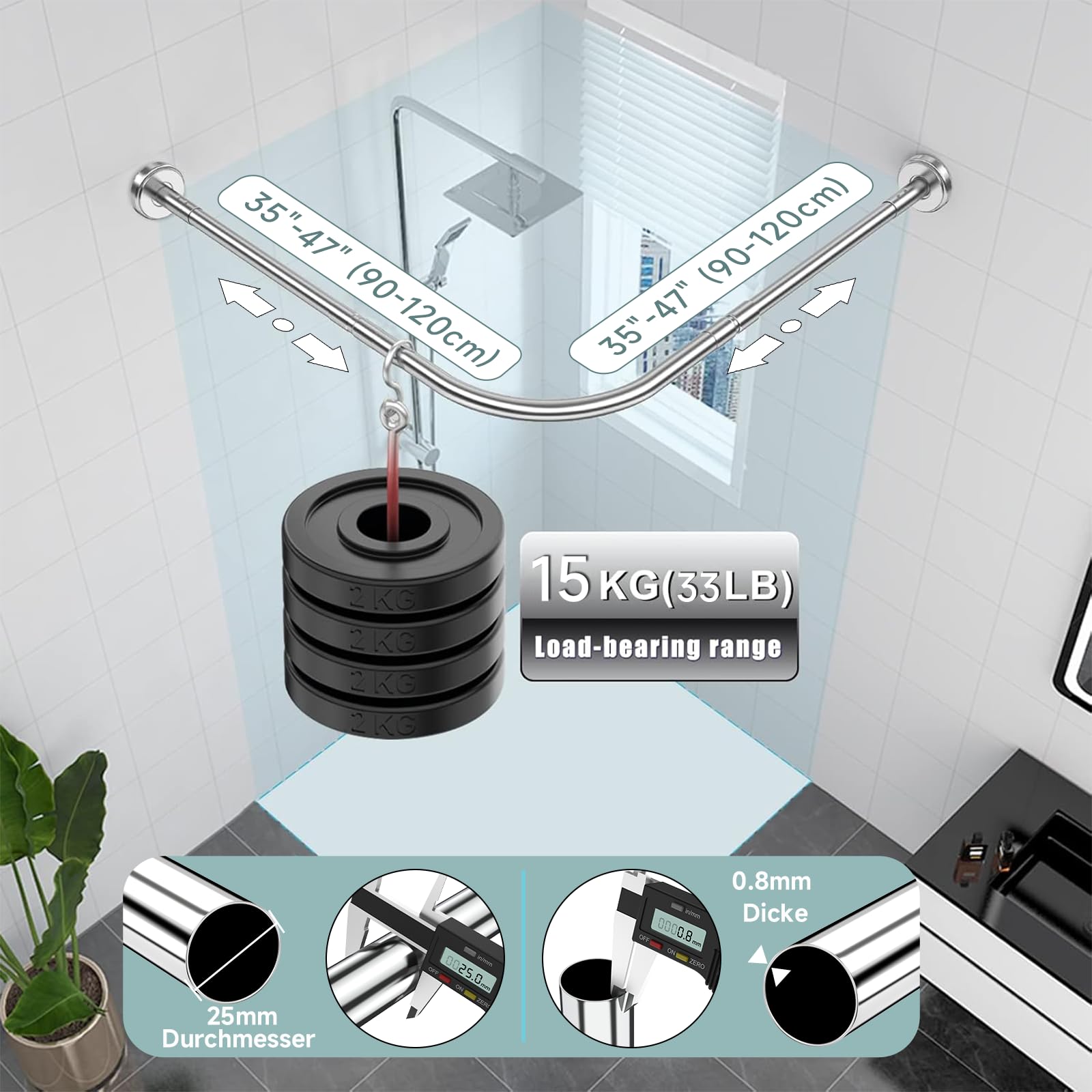 π The two sides of the telescopic shower curtain rod can be adjusted between 35-47 inches, making it an ideal solution for your bathroom shower. Expand and adapt to your specific bathroom layout. Please measure the length you need before purchasing. The corner shower curtain rod is suitable for 35-47 x 35-47 inches size.",