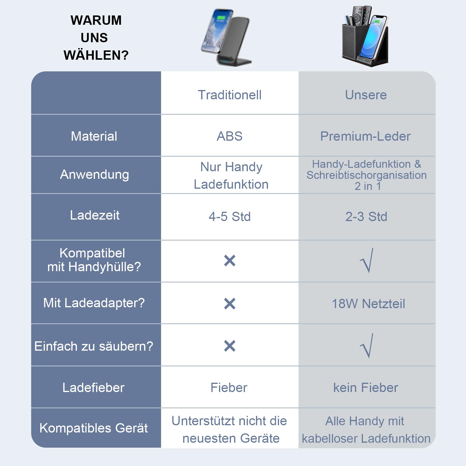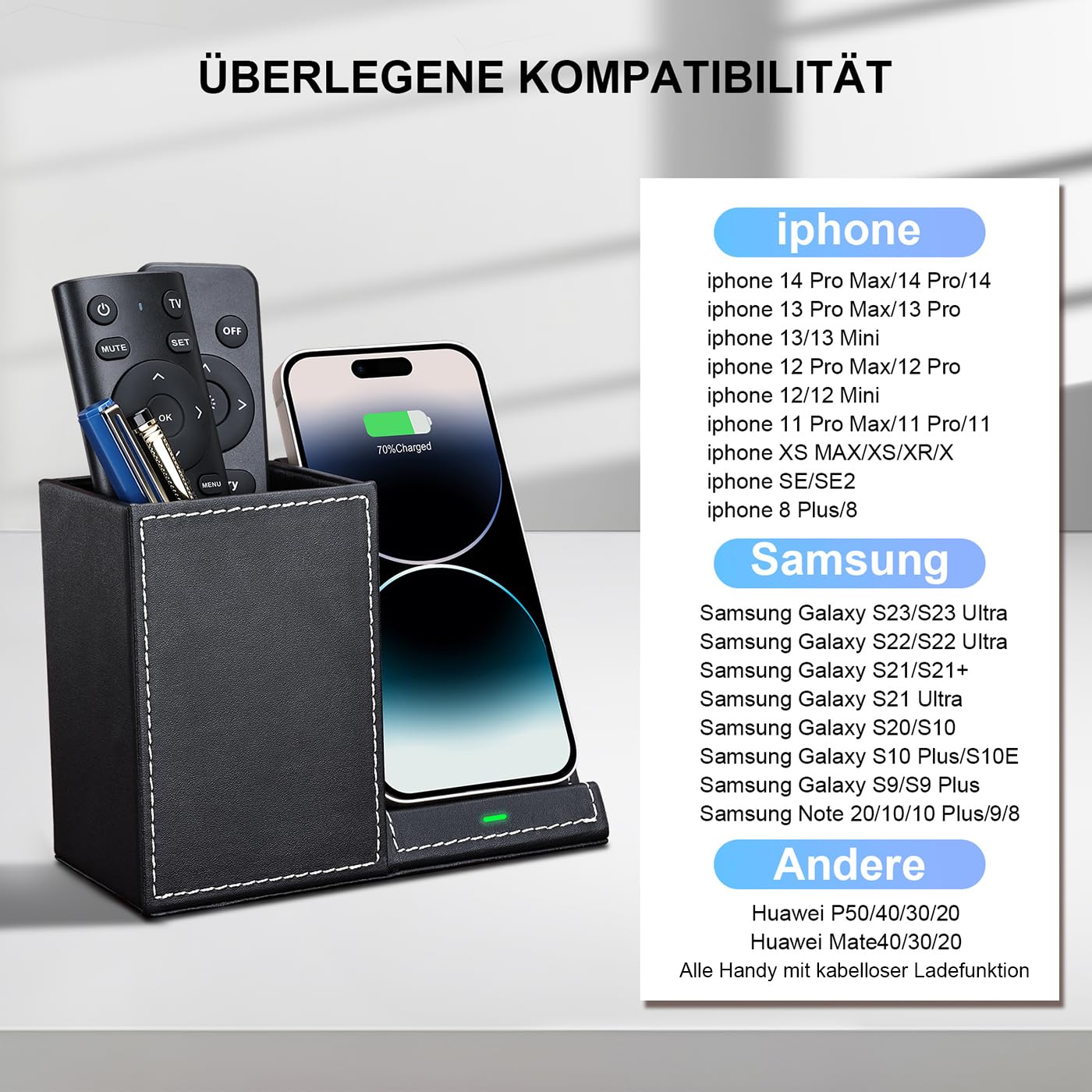 "Compact & Elegant - The compact design combining the inductive fast charger and desk organizer makes it space-saving. Perfect for use as a remote control holder, desk organizer, or office organizer for your home, bedroom, and office.",