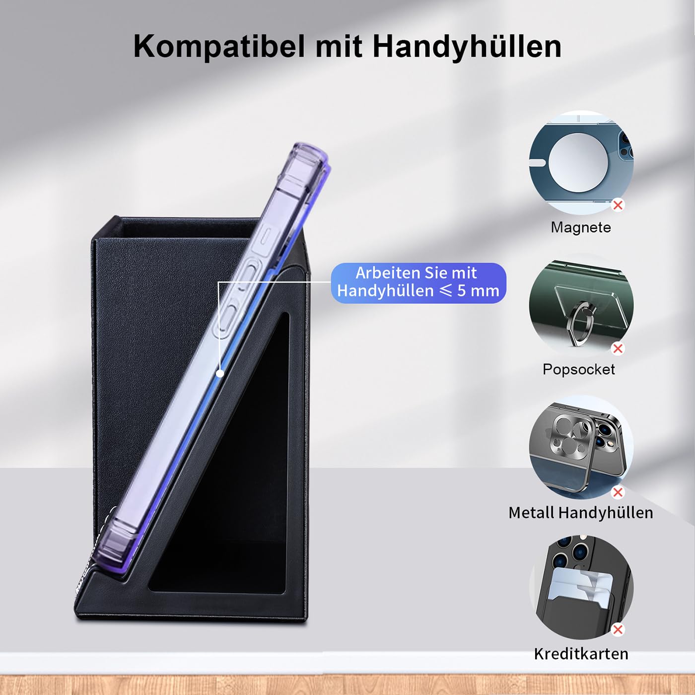 ["Say goodbye to messy desktops. This is not just a phone charging station, but also a desk organizer to keep your phone, pens, pencils, remote controls, scissors, and other small items well-organized. The ergonomic angle design also makes it a great phone stand that is comfortable for your eyes.",
