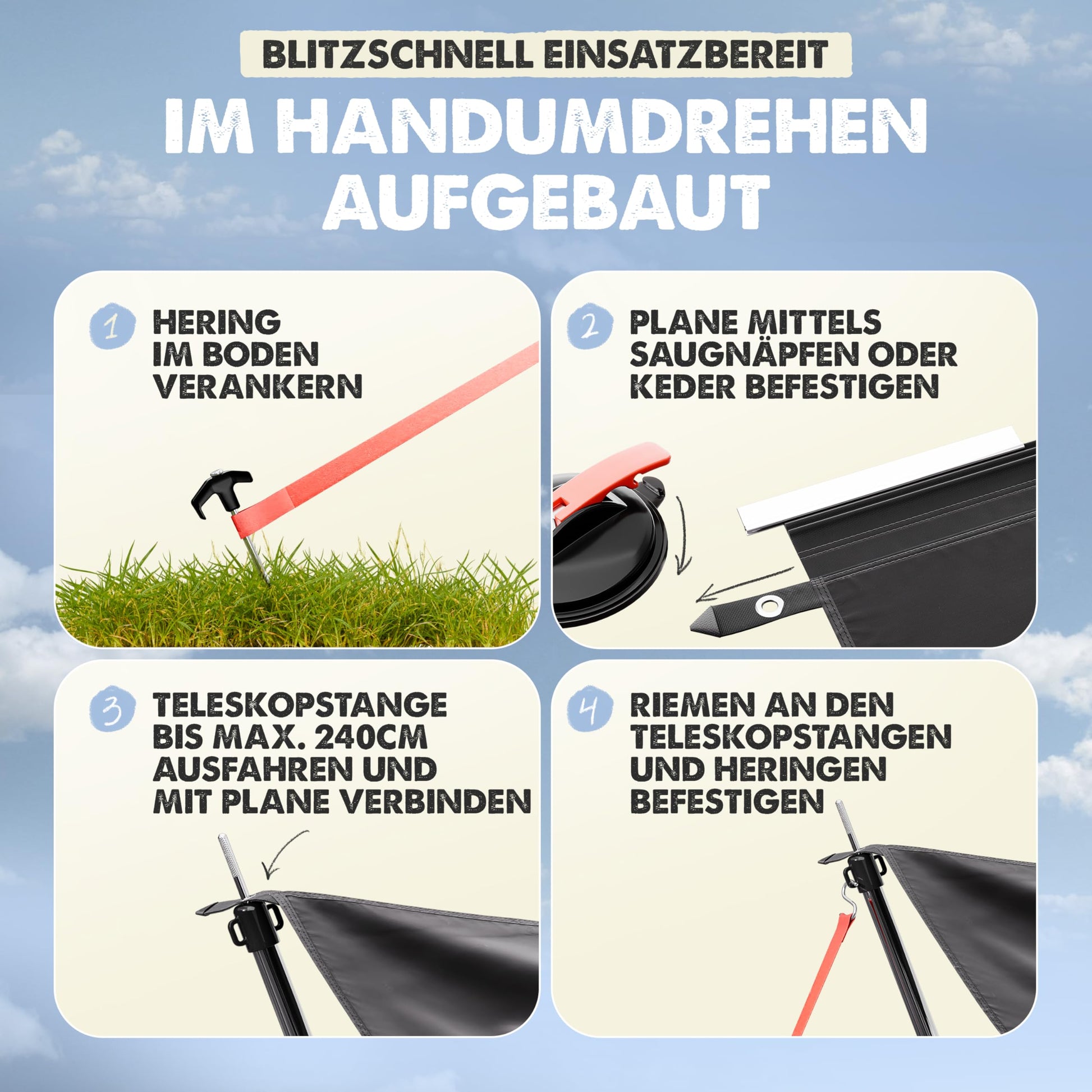 4 πππππ¦π§πππ¨π‘ππ¦π Γπππππππππ§ππ‘ - Secure the awning with one of the 3 rail sizes (4mm, 6mm, 10mm) or using the practical suction cups on the vehicle. Perfect for every camper and every vehicle!", "β