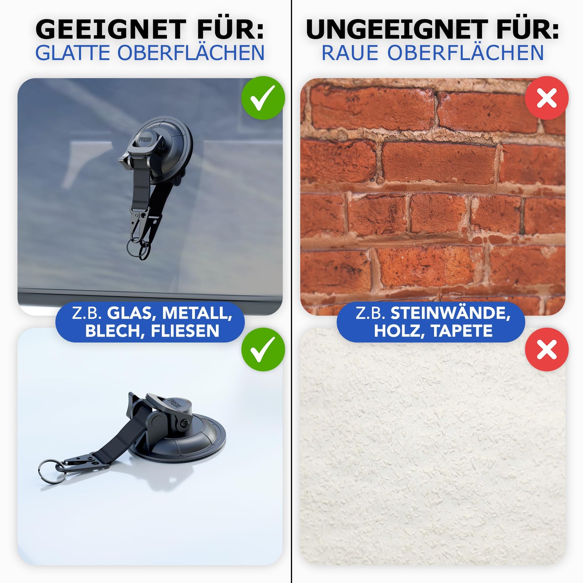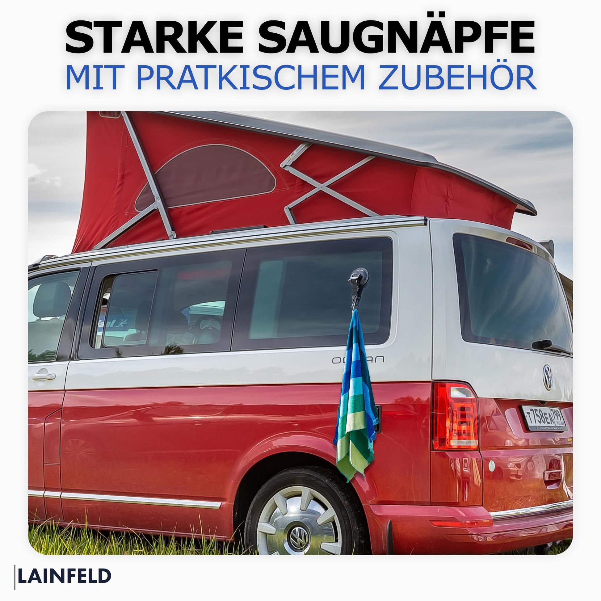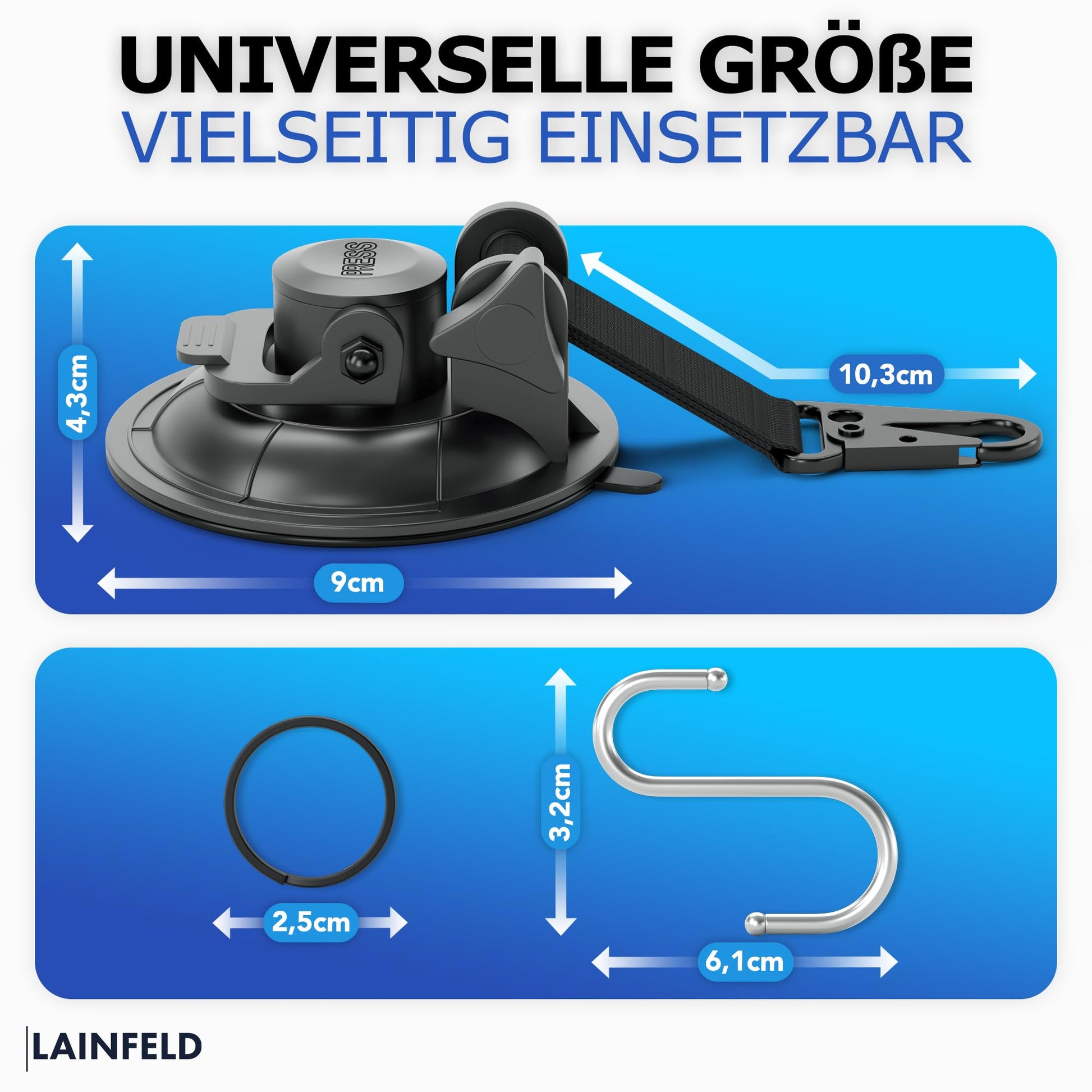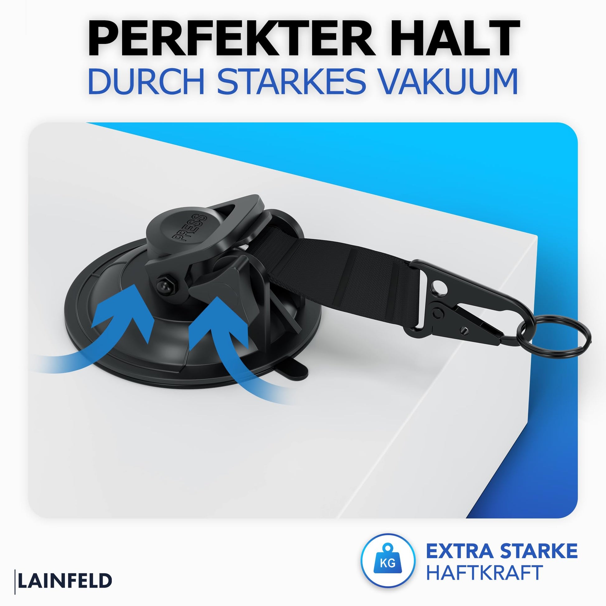LAINFELD Suction Cup Hooks | 2 pack with carabiner closure and large hooks | Extra strong | for camping, car, balcony | Suction hooks