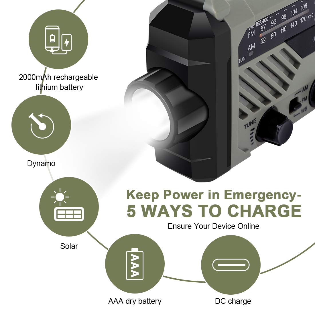 🔋【5 Power Sources】This weather radio with a built-in 2000 mAh battery has 4 emergency power supply options. ✦Solar panel: for generating power for the internal lithium-ion battery with direct sunlight; ✦Hand crank: for charging the radio when no other power source is available. ✦5V USB input: Save battery life when a power outlet is available. ✦3 AAA batteries (not included, as an emergency power solution).