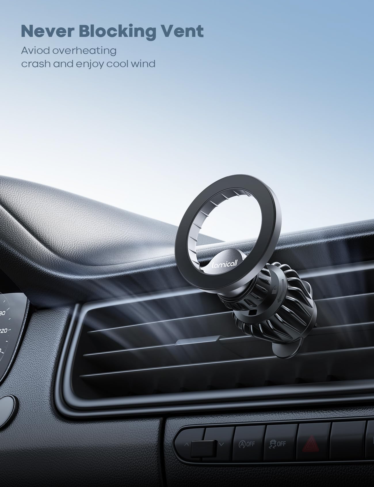 ["【2025 Super Magnetism】Lamicall MagSafe Car Mount has 20 x stronger N52 magnets built in. With powerful magnetic force, it can securely hold up to 10 phones. Even during a full brake or a drive on bumpy roads, the phone will not fall out. Furthermore, the holder has a ring-shaped closed magnetic field that does not interfere with the signal, ensuring smooth navigation and calls, allowing you to drive safely. Tip: The holder does not have a charging function.","【Compact and Exquisite】This MagSafe car phone holder is made of high-quality materials, very strong and durable. The small and lightweight design also reduces pressure on the vents and does not obstruct airflow. The surface of the holder is coated with a layer of silicone to prevent slipping and scratching of the phone. Provides additional protection for your mobile phone. Lamicall Magnetic Car Phone Holder, your helper on the go.","【More Stable Structure & Metal Hooks】The MagSafe car holder features the latest "hook clip design". Thanks to the stability of the triangle, the phone holder can be attached more firmly to the vent. In addition, the metal hooks are also more secure than regular clips and plastic hooks. This is a good solution to the common problem of broken hooks on the market. ❗ Note: Round vents are not compatible. Hook length 11mm to 27mm.","【One-Hand Operation & 360° Rotation】This magnetic car phone holder supports 360° rotation of your phone. With one hand, you can easily place and remove the phone. You can easily adjust the screen to the right viewing angle and also place the phone horizontally or vertically as needed. The holder is also very easy to install. You just need to insert the hook into the vent, turn the nut, and the mount will be secured.","【Compatible with All Smartphones】This magnetic car phone holder is suitable for all smartphones with MagSafe function, such as iPhone 17, 17 Pro, 17 Pro Max, iPhone Air, iPhone 16, 16 Pro, 16 Pro Max, iPhone 15, 15 Pro, 15 Pro Max, 16/15/14 Plus, iPhone 14/13/12 Pro Max/Pro, Mini, etc. If your smartphone does not have the MagSafe function, you can attach a metal ring (included in the package) to the case. With the metal patch, you can use the holder normally. Therefore, this holder can be used for all smartphones."]