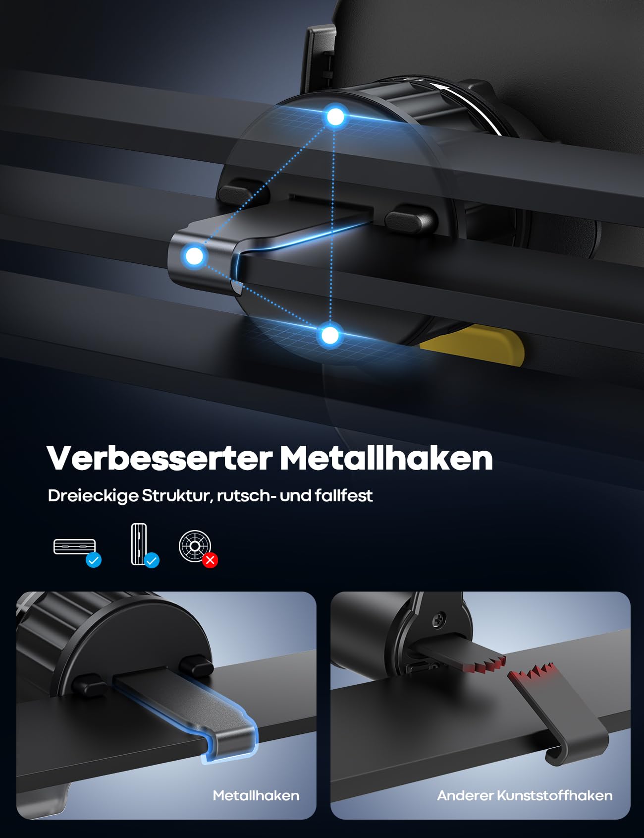 ["【Spring Clip Design & 1s Installation】The 2025 Lamicall car phone holder uses an automatic spring clip and metal hooks. One-handed operation, simply insert the metal hook into the vent, tighten and lock it, and complete the installation in 1s without repeated adjustments! In addition, the surface of the spring clip is wrapped with a thick layer of silica gel to perfectly protect the vent.","【One-Hand Operation】With the yellow quick-release button, you can quickly remove the smartphone within one second. The adjustable clamp arm can easily and securely grip the mobile phone; The 360-degree rotatable joint provides you with the best viewing angle. These designs of this phone car holder allow you to operate with one hand and provide you with safer and more comfortable travel and journeys.","【Innovative Material】The car phone holder smartphone is made of high-quality translucent acrylic material and innovative airbag rubber pad. The airbag silicone pad on both arms and the thick silicone pad on the legs fully cover and protect your phone comprehensively and effectively from scratches. No matter how bumpy the road is, it can securely grip the phone to prevent it from falling.","【Stable Structure & Metal Hooks】Self-retracting spring hooks do not damage the vent by rotating too tightly, and the metal hook is stronger and not easy to break. A solid triangular structure is formed between the universal car phone holder and the air outlet, fixing the car holder firmly on the air outlet and effectively avoiding the risk of the phone holder falling. Note: The hook extends 11mm-23mm. Round vents are not compatible.","【Wide Compatibility】Lamicall car vent phone holder is compatible with 4-7 inch devices, such as Apple iPhone 12 Pro, iPhone 12 Pro Max, iPhone Air, iPhone 11 Pro, iPhone 11 Pro Max, iPhone 11 Plus, iPhone 10 Plus, iPhone 10 Pro, iPhone 10 Pro Max, iPhone 9 Pro, iPhone 9 Pro Max, iPhone 8 Pro, iPhone 8 Pro Max, iPhone 7 Pro, 6 Mini, 6 Pro Max, 5 Pro, 5 Pro Max, Xs Max Xs XR X 8 7 7s 6s 6 Plus, Huawei Mate 30 20 10 Pro P30 P20 P10, Samsung S22 S21 S10+ S10 S9+ S9 S8 S8+ S7 S6 S5, Note 9 8 7 6, LG, HTC, for Sony, Nokia, Nexus, etc."]
