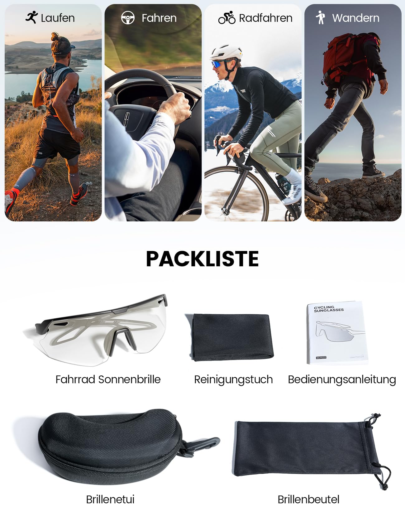 ["Wide Application"] These cycling glasses come in a variety of cool colors, combining fashion & functionality. In outdoor sports, they are not only practical tools but also exquisite fashion items. Ideal for cycling, hiking, running, fishing, baseball, skiing, racing, climbing, and more. Package includes: 1× Lamicall self-tinting cycling glasses, 1× glasses case, 1× glasses pouch, 1× cleaning cloth, 1× user manual.