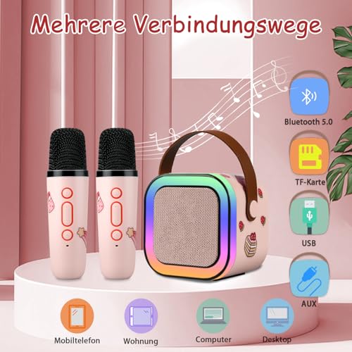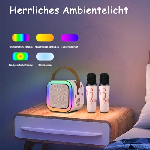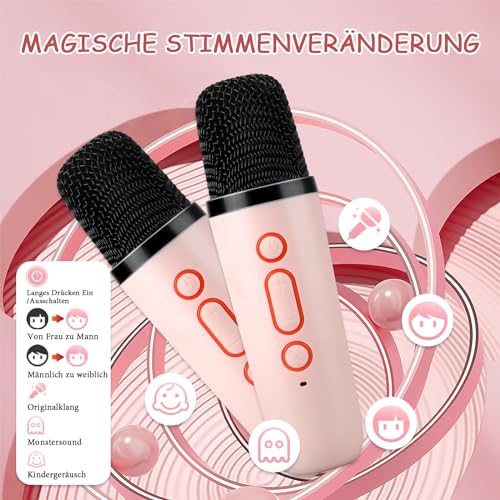 ["đ€ăSafe and Durable Kids Karaoke Machineă The karaoke machine for kids and adults comes with 2 wireless microphones, advanced audio driver, and noise reduction technology. It features rounded edges, a sturdy structure, and user-friendly design so that kids can easily operate it and have a pleasant singing experience.","đ¶ăFun Voice Change and Colorful LED Lightsă Enhanced karaoke system with advanced audio driver and digital signal processor, offering 5 different effects to change your voice and provide more fun for your kids (including original sound, female voice, male voice, monster voice, baby voice). There are 5 lighting modes that can be customized as desired. The LED lights dance to the rhythm of the music, creating a cheerful atmosphere.","đŒăConnect Anywhereă The karaoke machine has multiple connectivity options, including Bluetooth, USB, and AUX, providing versatility. It uses advanced Bluetooth 5.3 technology to ensure a fast and stable connection with your mobile devices such as Android phones, iPad, tablets, PCs, etc. (Note: Placing the microphone too close to the karaoke machine may cause harsh and strange noises. This is a common form of audio feedback. Therefore, try to keep the microphone as far away from the speaker as possible.)","đ”ăPortable and Long-lastingă This karaoke machine is compact and lightweight, making it easy to transport and store. The built-in 2000mAh battery ensures 4-6 hours of playtime. With this portable wireless speaker and microphone, you can enjoy karaoke anytime, anywhere. Birthdays, outdoor activities, travel...","đăExquisite GiftăStylish design and beautiful packaging box make it a cool toy for girls and boys aged 3-12, a great birthday or Christmas gift for your kids, friends, or family. If you encounter any problems using our products, we will do everything to provide you with a good shopping experience!"]