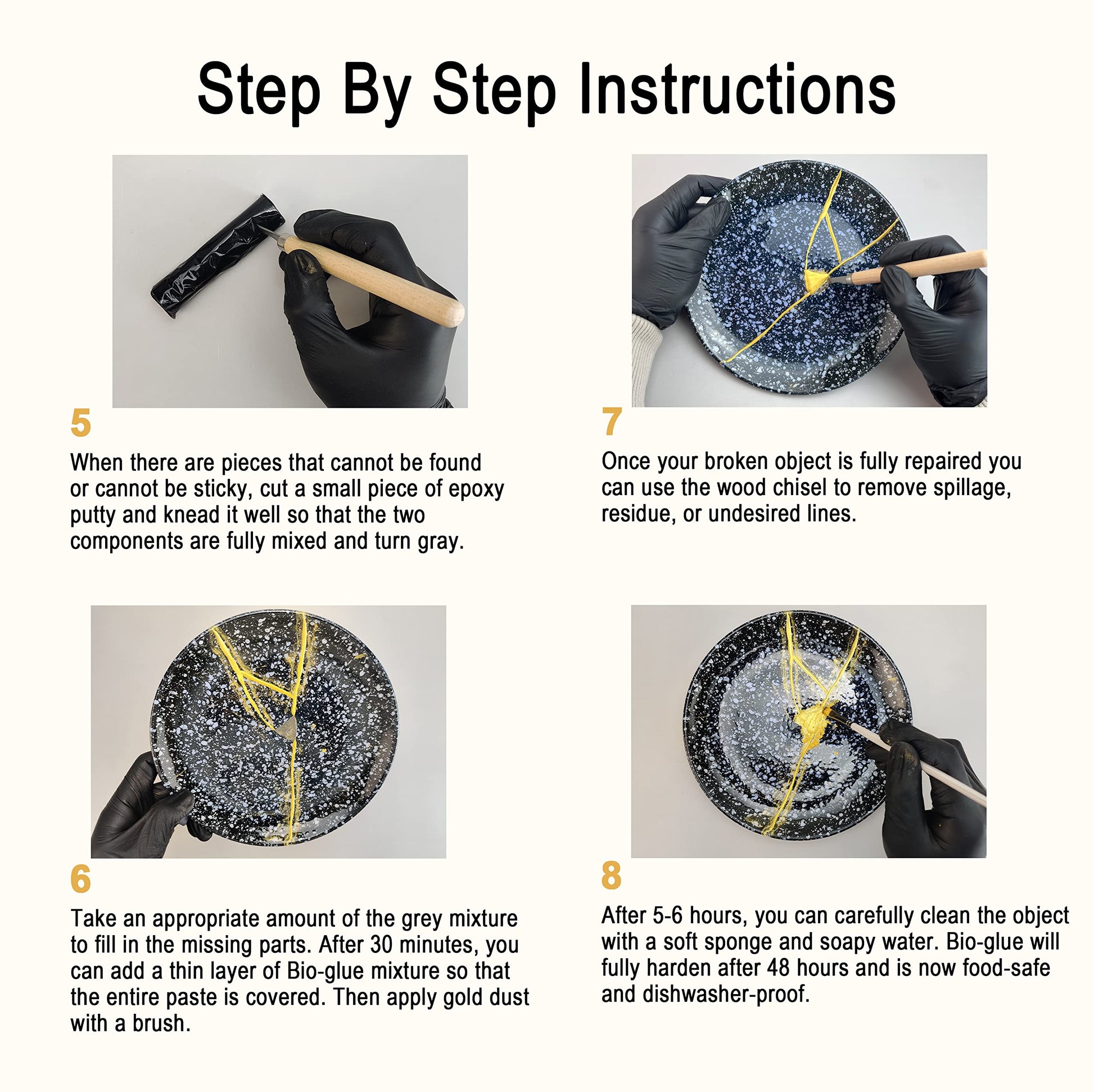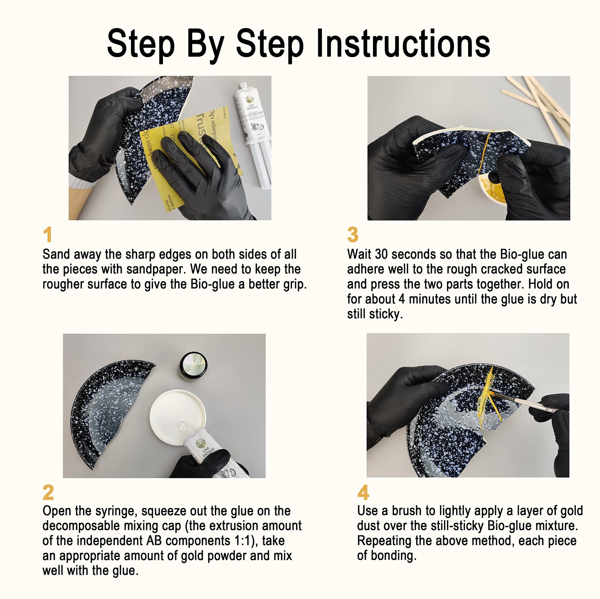 ["Kintsugi set: The Kintsugi Repair Kit gives you a taste of Japanese Kintsugi repair craft, where broken objects are repaired with gold powder glue to create a unique artwork with golden cracks.","NATURAL BIO-RESIN: LAMXIN bio resin is specifically designed for use in bio kintsugi repair kit. The ingredients are extracted from cashew nuts, pure and natural. Finding nut particles in the glue is normal.","DISHWASHER SAFE: LAMXIN bio resin and epoxy cure within 5-8 minutes, then you should clean the objects before consuming. After 24 hours, the repaired objects are safe for the dishwasher.","EASY TO USE: Take a small amount of gold powder with a bio disposable mixing spatula and mix it with bio epoxy glue. Apply the mixture to the porcelain pieces to be repaired, stick them together, and wait for it to cure.","SUITABLE FOR VARIOUS MATERIALS: LAMXIN bio kintsugi kit is suitable for various materials such as glass, wood, marble, and concrete objects. If your valuable porcelain is broken and you want to repair it to save it. Use our bio Kintsugi repair kit to save broken porcelain! Give it new life and beautify the scars."]