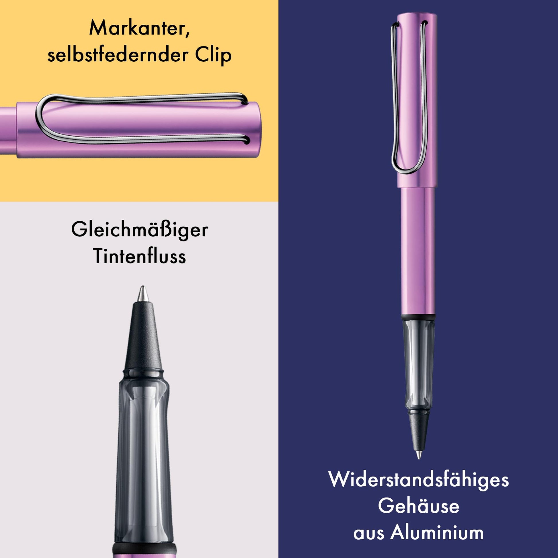 Lamy AL-star lilac Rollerball - light pen with transparent, ergonomic grip & medium nib - aluminum body - includes medium rollerball refill M 63 in black.