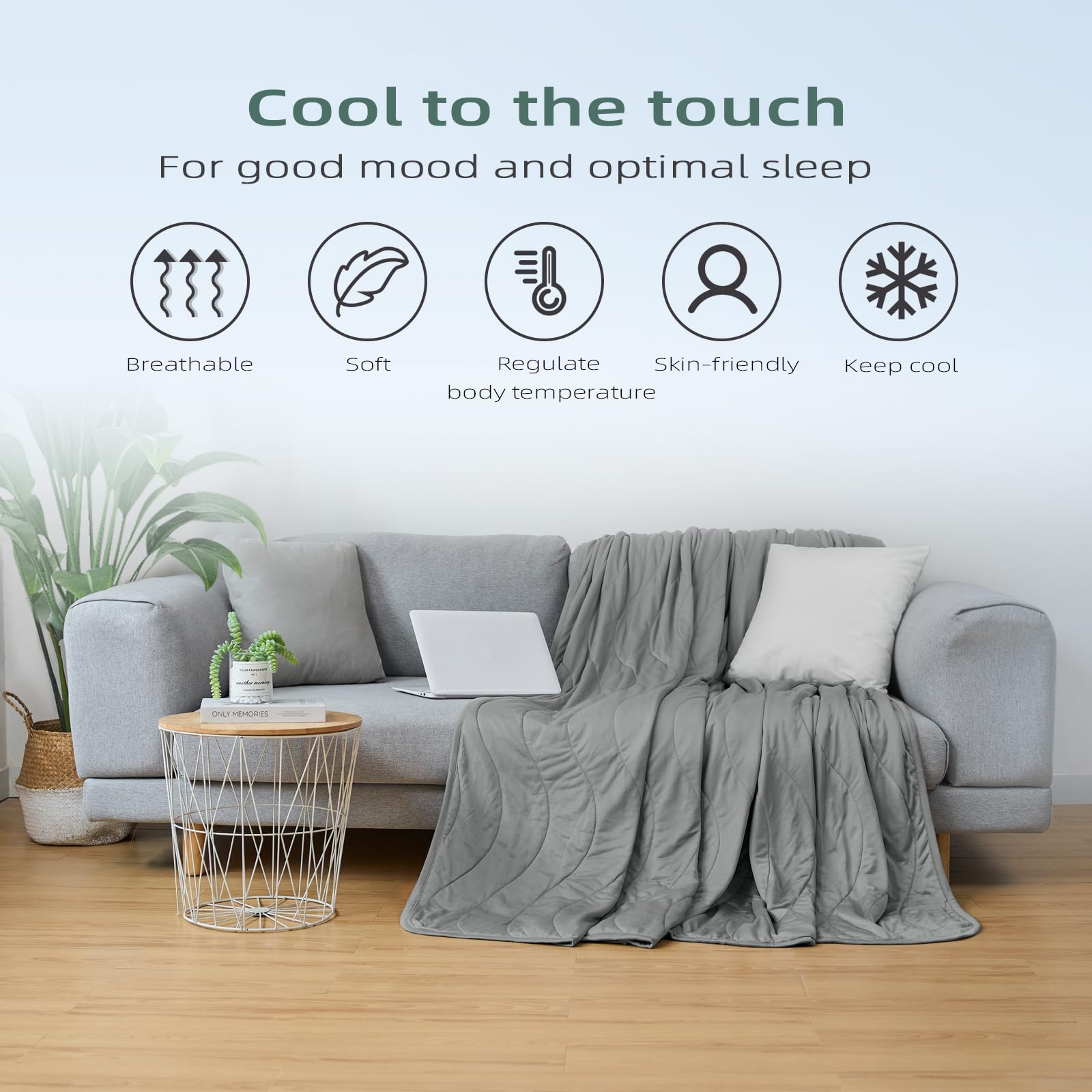 ["Description: Double-sided Arc-Chill cooling fiber combined with ultra-light fiber filling, The ventilation rate is improved by 30%. Wave-shaped spatial seams ensure fluffy and uniform filling without clumping. Skin-friendly materials, so it can be safely used for sensitive skin and pet families","Upgraded Cooling & breathable Fabric: Equipped with patented Arc-Chill cooling fiber (Q-Max 0.45+). It cools by 2-3°C at the moment of touch, continuously absorbs body heat and sweat, providing an unparalleled cool sleeping experience. You can enjoy "cool blankets for sleeping"","Versatile Awendungsfälle: At home, it can be used as a summer blanket/sofa blanket. For outings, it is suitable for airplanes, high-speed trains, and camping scenes. One cloth meets the requirements of afternoon naps, overnight stays, and outdoor recreation in all four seasons","Maintenance: Machine washable (recommended with laundry bag) and hand washable, Gentle clean at 40°C water temperature without deformation; Combines ventilation, antibacterial, acaricidal, abrasion resistance, and moisture protection","Versatile Use & Ideal Gift: Available in 2 colors and 3 sizes, It is an ideal gift for family members and friends for occasions such as birthdays, Valentine's Day, Mother's Day, Father's Day, etc., Suitable for personal or family use"]