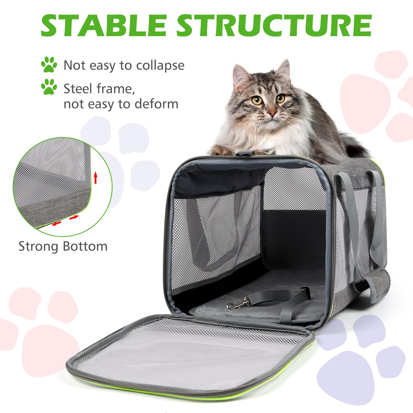 "【Sturdy & Practical】- This cat carrier crate is made of metal frame and Oxford fabric to stay firm and not collapse. The side pocket is convenient for storing snacks, pet ID cards, and other travel accessories. The interior safety strap can be attached to the animal's collar to ensure the safety of your pet. The luggage strap allows you to attach the pet carrier to luggage, making it convenient to travel with luggage.",