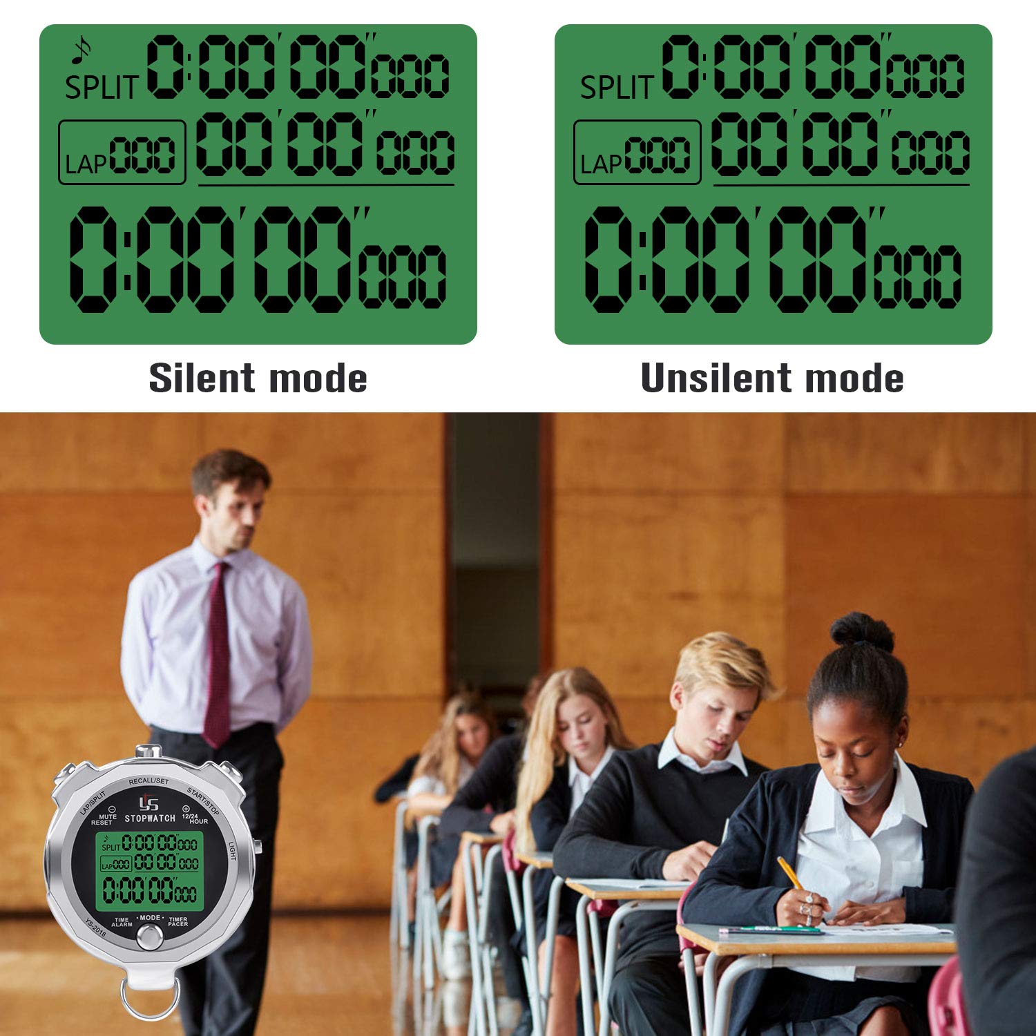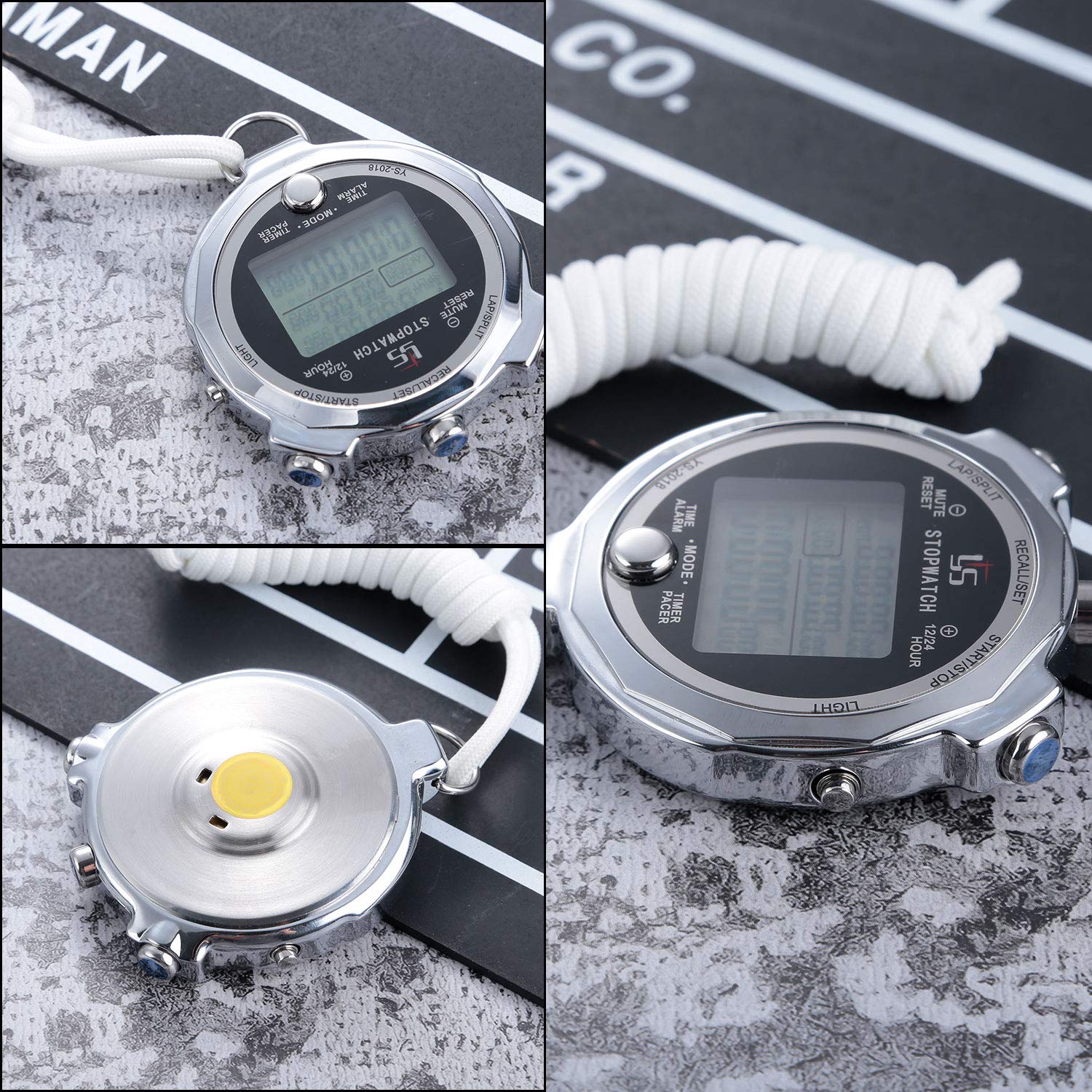 ["High quality material and Silent function - Metal, very durable. Stopwatch with Silent mode, absolute silence, no more "BEEP", simply switch between silent and normal mode.","100 Memories - Very practical with an accuracy of 1/1000 seconds, meeting the most basic sports needs.","Light function - Side button can turn on light for a few seconds, so you could use it at night.","Multifunctional stopwatch - Soccer function, Shutdown function, Timing function, Alarm function, Clock function, Countdown function, Metronome for sports coaches, referees, athletes, soccer players, runners, etc.","Large display and ergonomic design - With large screen and extra large numbers, it is easy to display the time and record data. The ergonomic design feels comfortable and flexible in your hands when pressing the buttons."]