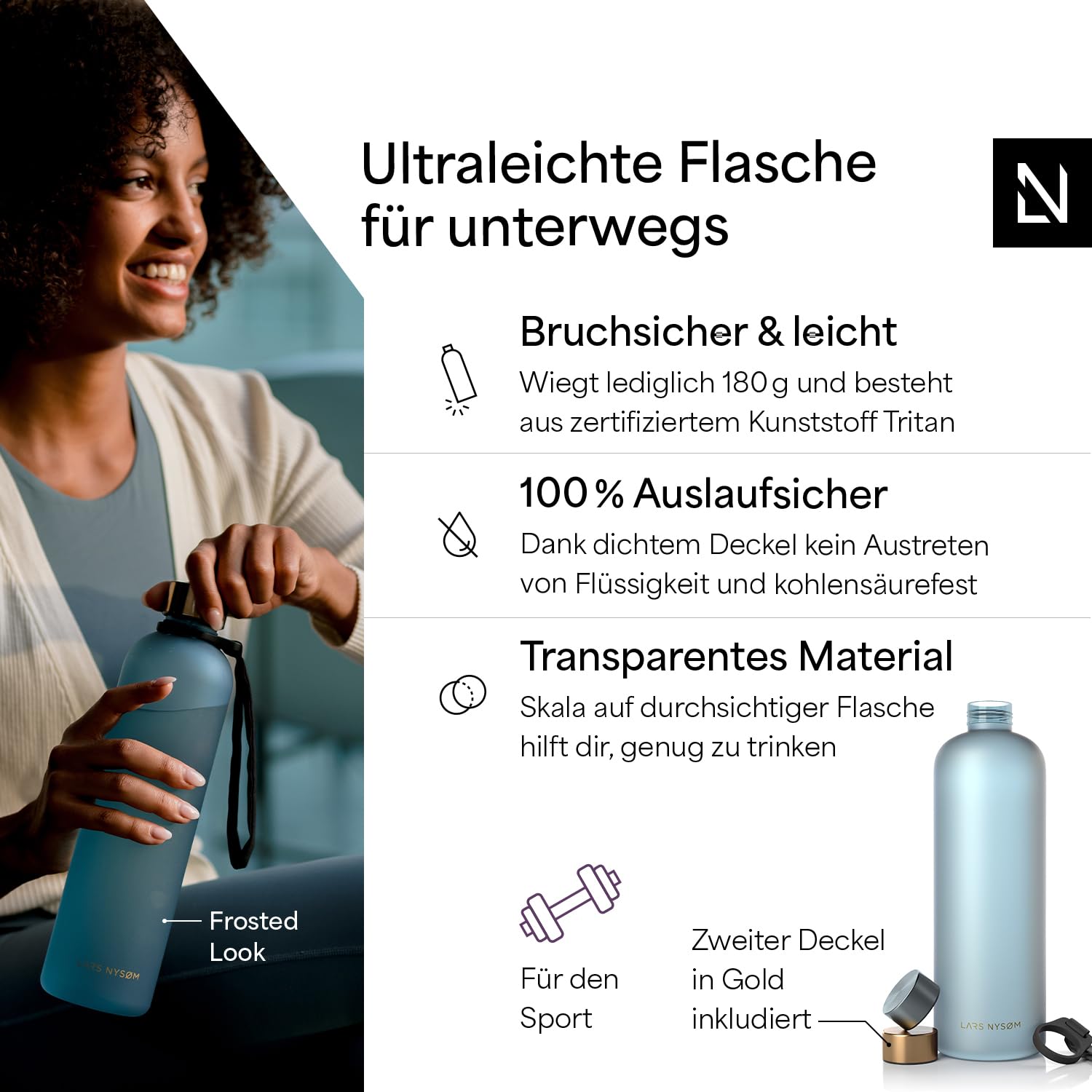 ["✅ FUNCTIONAL DESIGN: The stylish water bottle "Blæst" by LARS NYSØM impresses with well-thought-out design and excellent functionality. Perfect for office, sports, biking, or yoga.","✅ ULTRALIGHT & SHATTERPROOF: With the Tritan water bottle, you get the perfect companion for on the go. Thanks to the carrying loop, the bottle always sits securely in your hand.","✅ ROBUST & REUSABLE: The sturdy and durable sports bottle is a reusable alternative to disposable bottles. The water bottle is taste-neutral and neutral.","✅ LEAKPROOF: The bottle is leakproof and suitable for carbonated drinks. The practical drinking reminder always shows you when it's time for a refill.","✅ THE BEAUTY OF SIMPLICITY: We at LARS NYSØM firmly believe that everyday essentials can make each day a bit better. That's why each of our products is developed with the goal of taking its users out of autopilot mode - a goal that is as simple as it is beautiful, just like our products."]