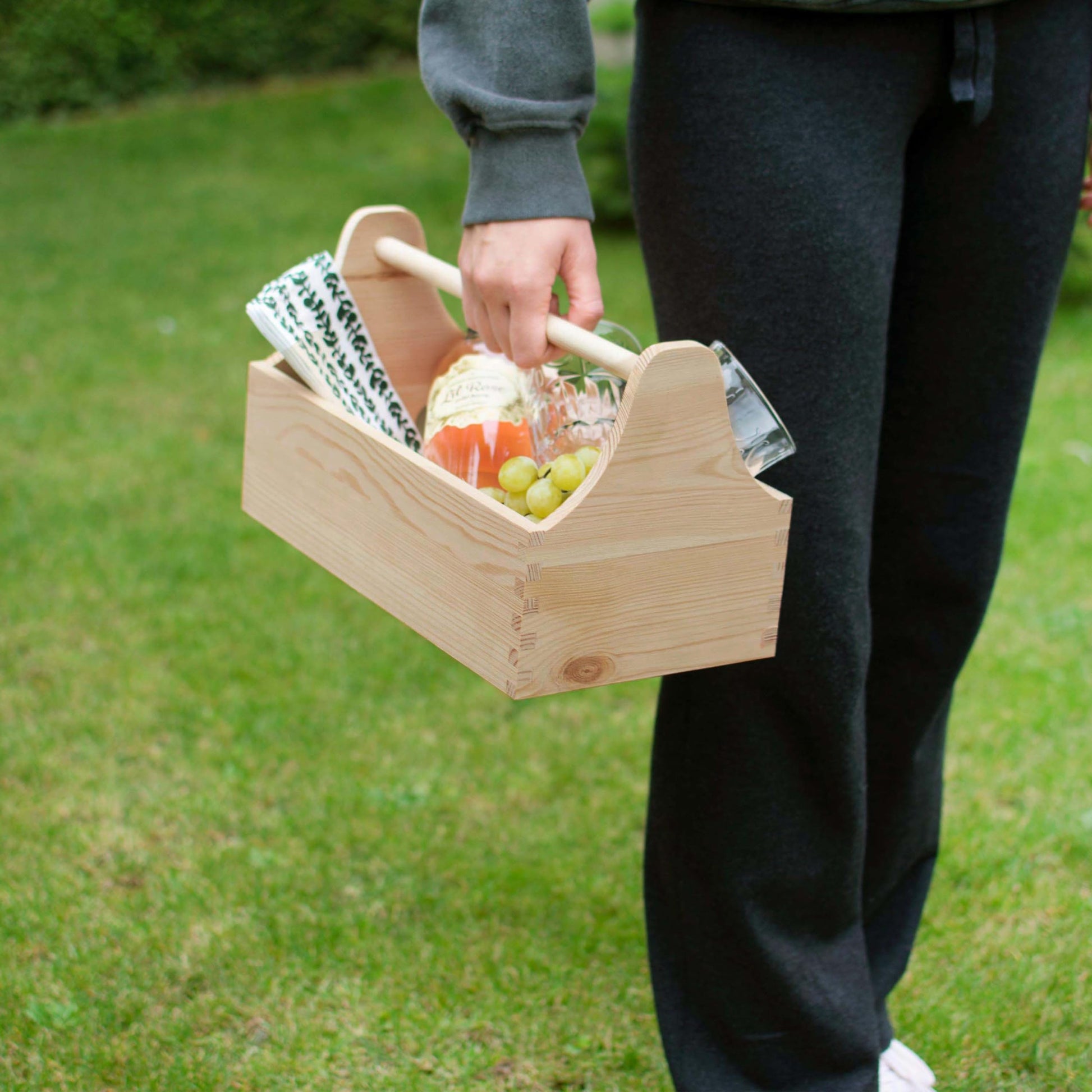 "Wooden tool box for storing hammer, screwdriver, pliers, and small items like screws & nails. The tool carrier has a round wood handle for easy transport of things!"