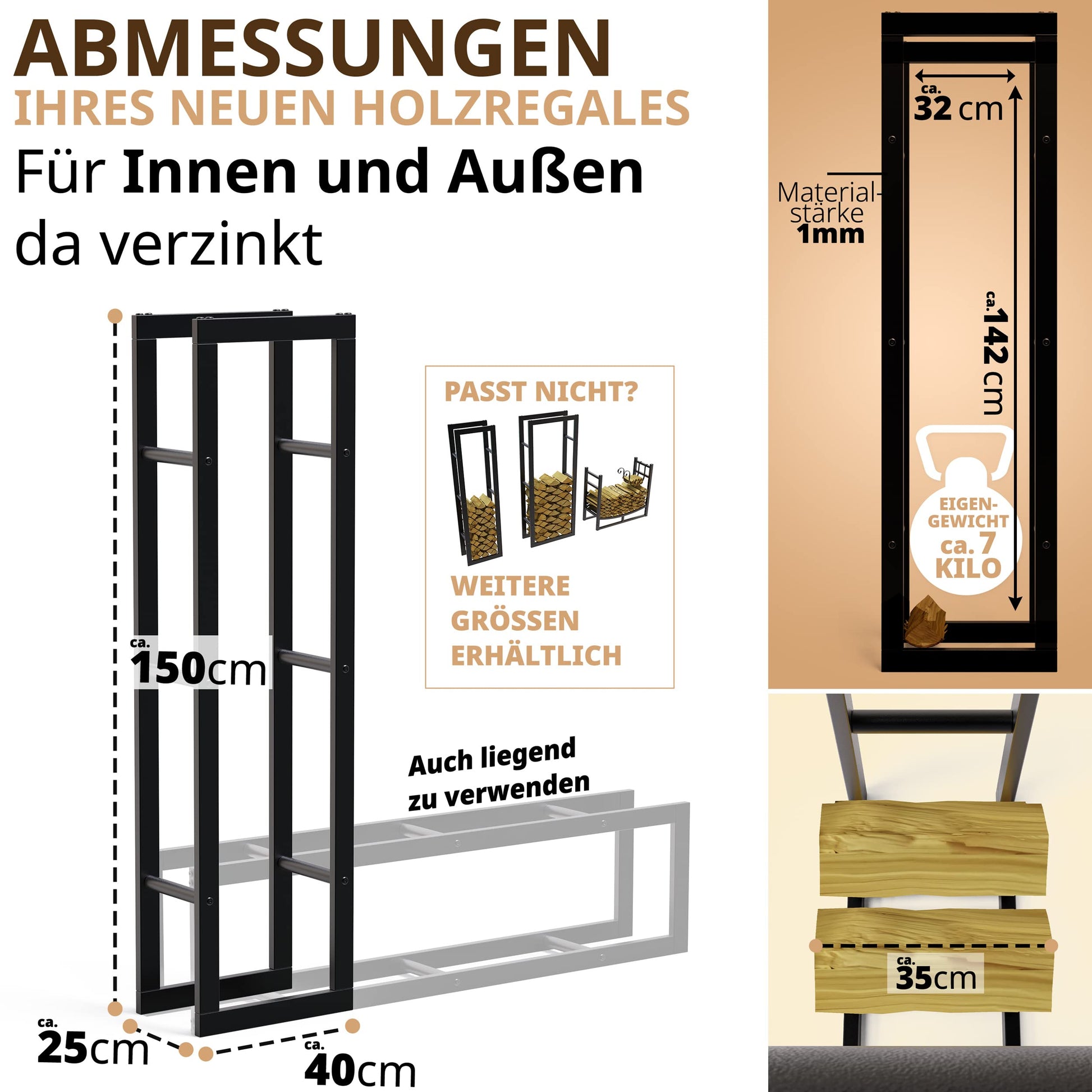 SIZE! The dimensions of HxWxD = 150cm x 40cm x 25cm are ideal for smaller spaces and allow storage of approximately 150 litres of firewood. In larger rooms, 2 of our metal firewood racks will be more prominently displayed. The load capacity is tailored to the volume and allows for full use of the rack.