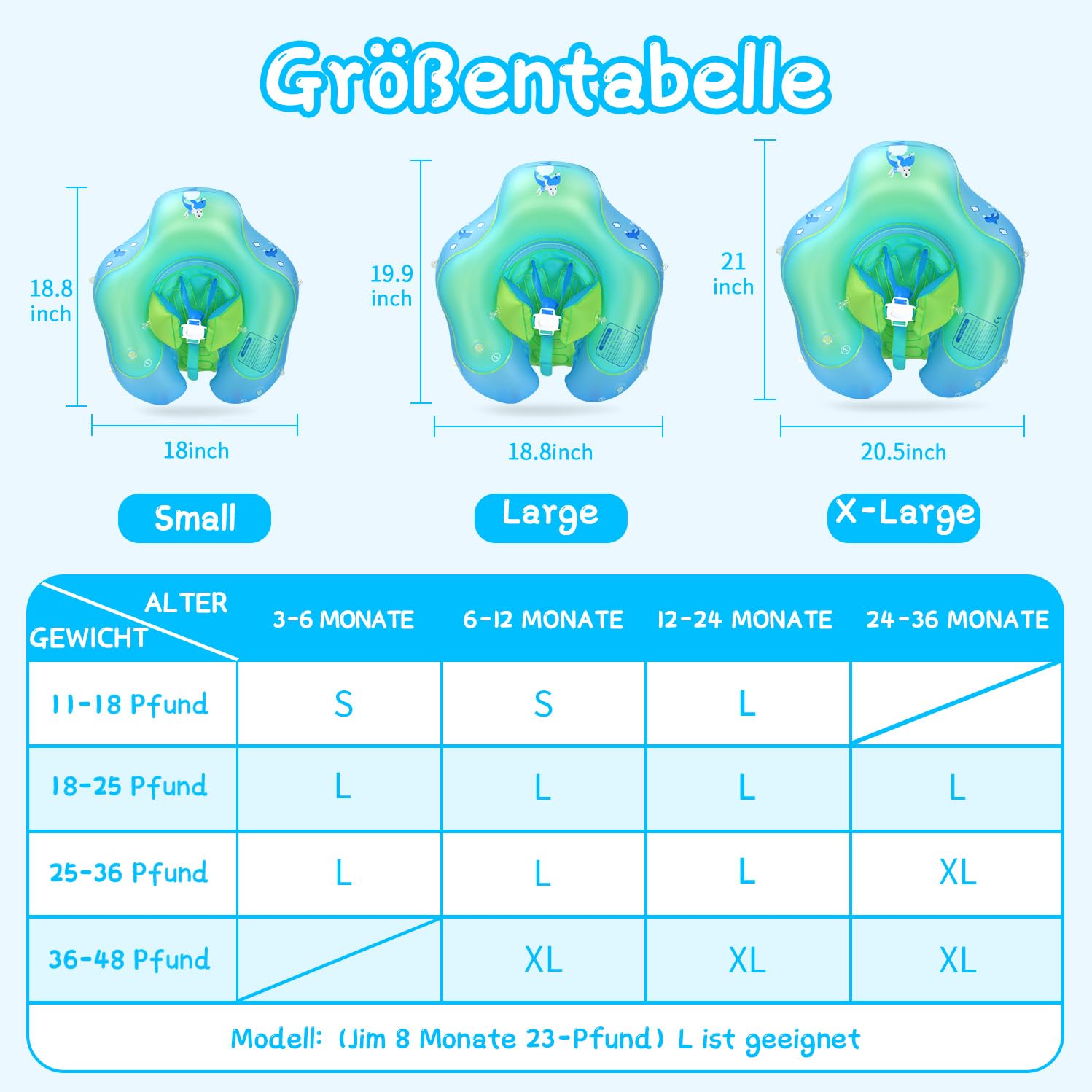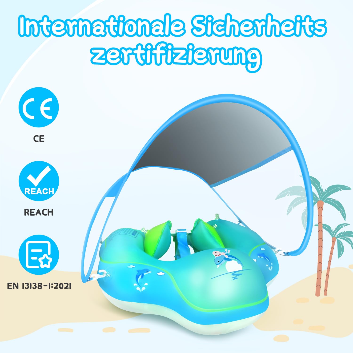 ["【With Sun Canopy UPF50+】The baby swim ring comes with a removable/adjustable sun canopy that can be adjusted from 0°-60°-120°, with UPF50+ protection to shield your baby's skin from the sun in every way. Please note: The sunshades are a gift and can only be used on the shore.","【Anti-Tip Design】The LAYCOL baby swim ring is a dual-layer inflatable structure for excellent buoyancy/stability in the water, preventing your baby from tipping or sliding forward and improving swimming comfort. The bottom has an adjustable safety strap and is suitable for babies of all sizes from 3 to 36 months.","【Safety Material for Babies】Tested according to the latest standard EN 13138-1:2021. Baby Swim Float is made of durable PVC material and complies, making it 100% safe, non-toxic, and friendly on baby's skin.","☀【How to Choose the Size】Recommended for weight 11-24 lbs, 3-7 months (Size S); weight 13-38 lbs, 5-18 months (Size L), weight 28-48 lbs, 18-36 months (Size XL), or you can contact us, we will recommend the size for your baby.","【Attention】This is a swimming aid and should only be used under adult supervision. Do not use in a child's standing depth. To prevent excessive expansion, please check the inflation saturation to about 90-95%."]