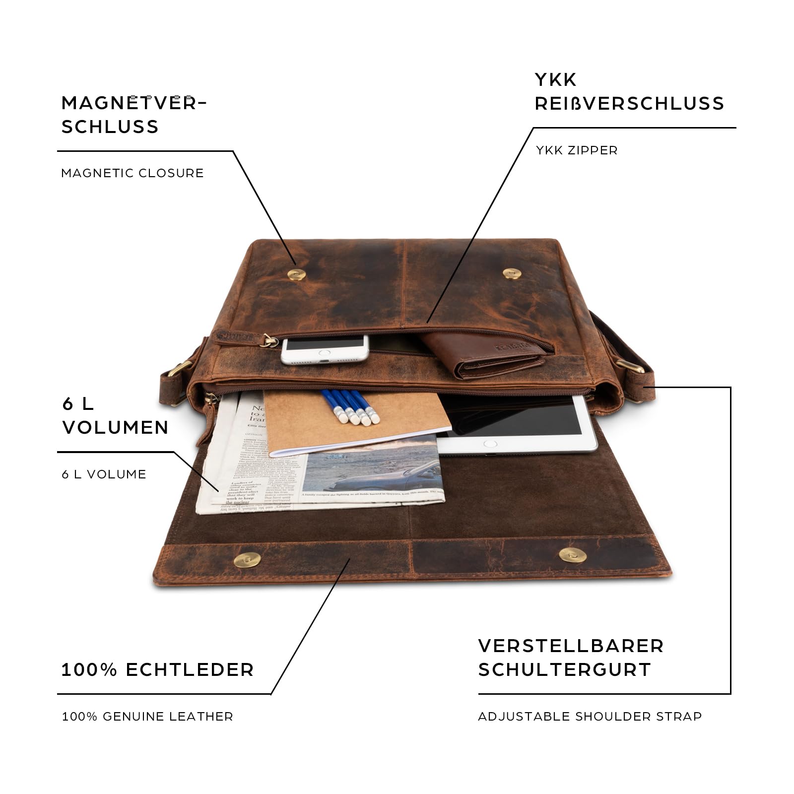 CLASSIC DESIGN - The shoulder bag from the Gent series is timeless and elegant at the same time, ideal for business and leisure as a messenger bag, work bag, notebook bag, school bag, teacher's bag, travel bag, briefcase, handbag, carry-on bag or shoulder bag