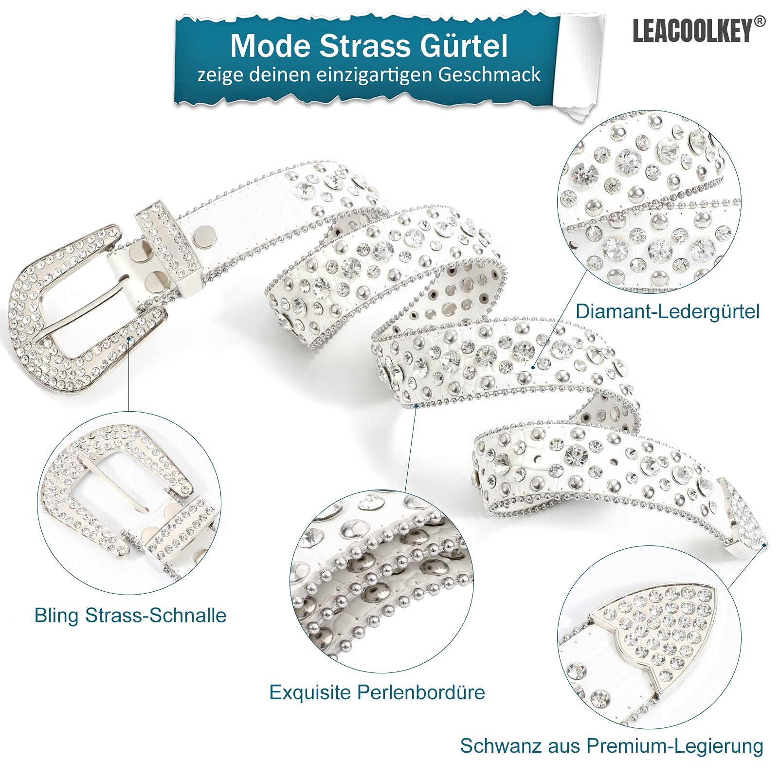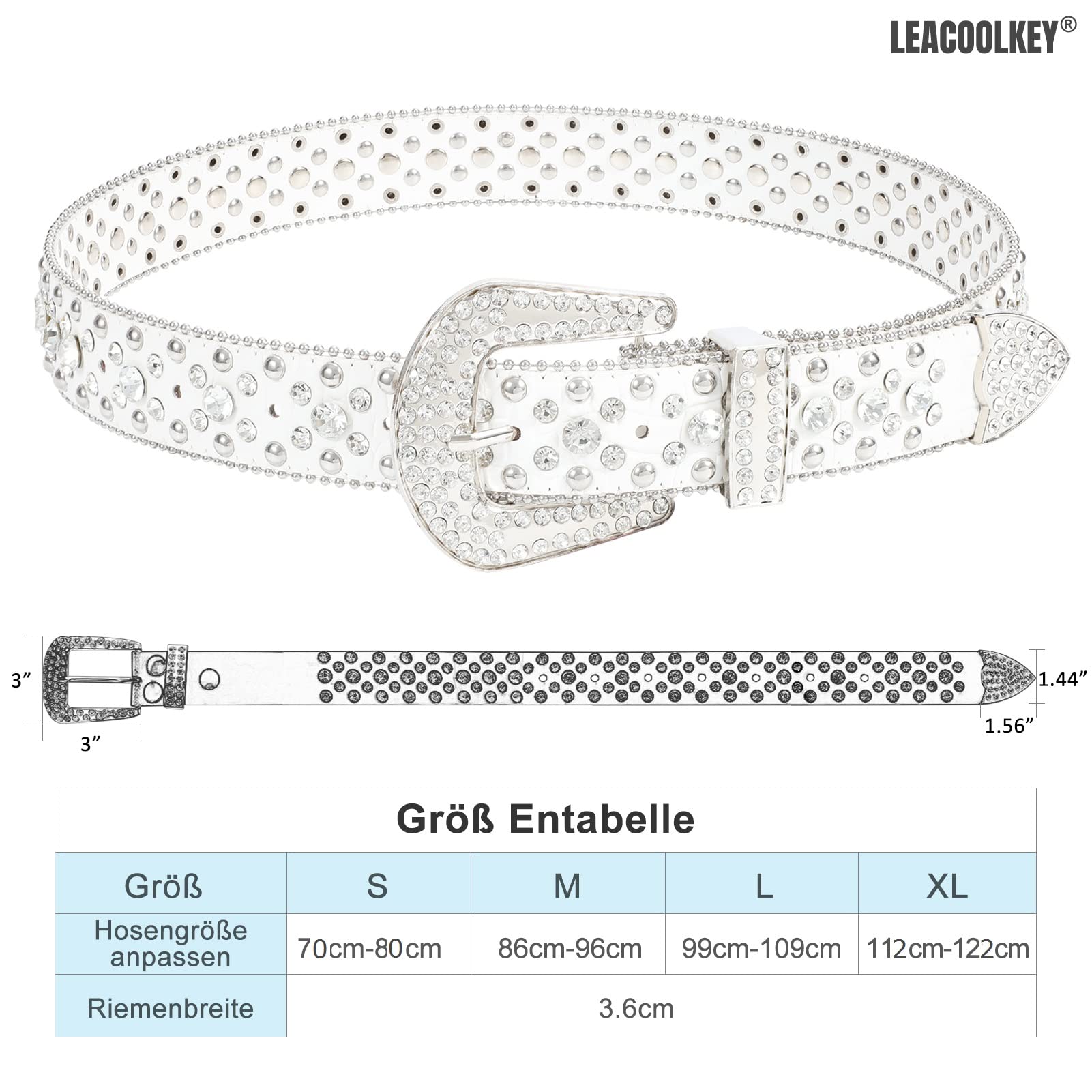LEACOOLKEY Rhinestone Belt for Women for Jeans, Western Cowgirl Rivet Punk PU Leather Belt, Women's Black Rhinestone Belt (S: Fit waist size 70cm-80cm = 105cm total length, B-White)