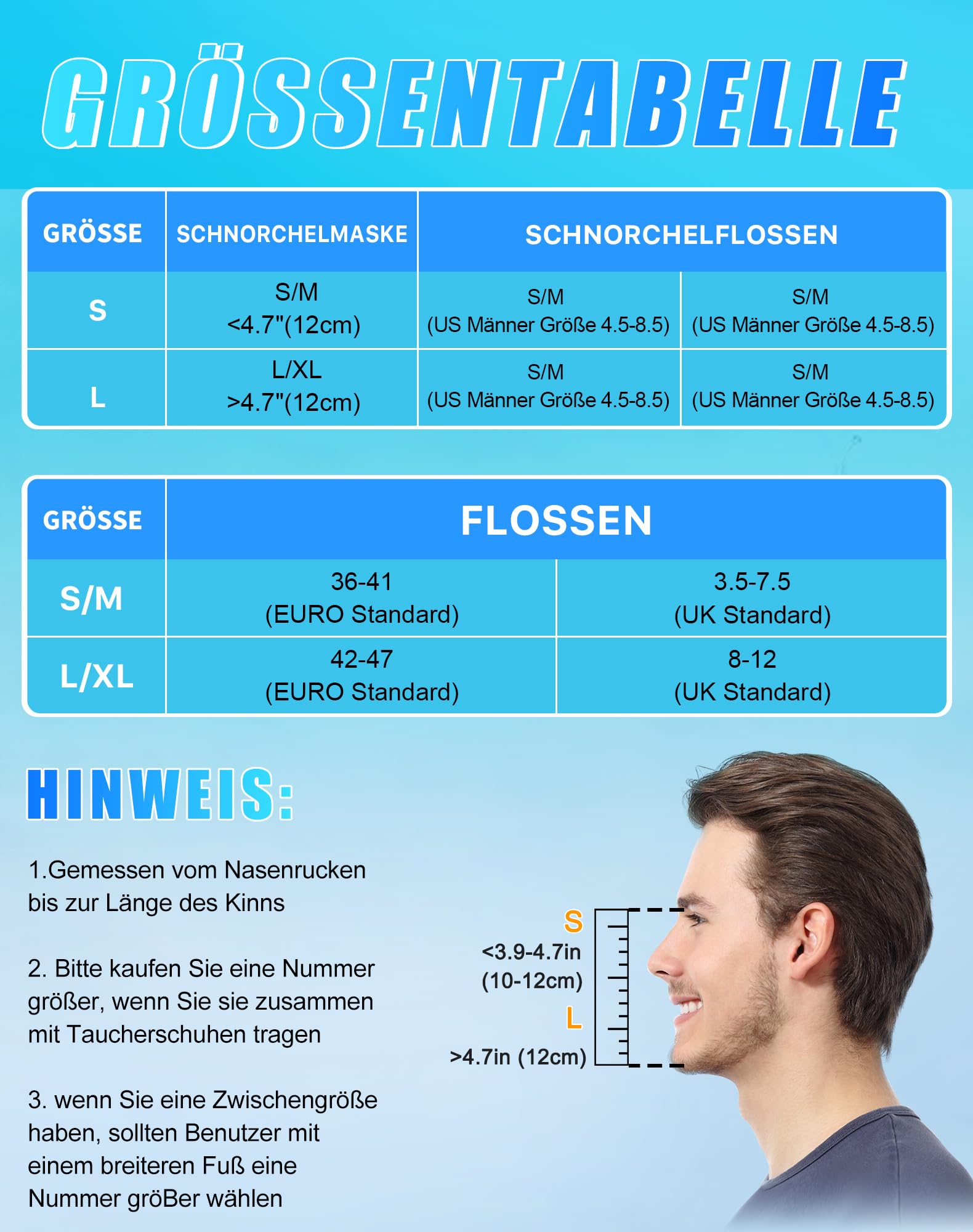 ALL-IN-ONE SNORKEL SET: This snorkel set fits easily into the included storage bag, perfect for on the go, and we have included a pair of soft silicone ear plugs for your comfort while snorkeling! Our snorkel sets come in various sizes, please check the size chart before making your decision. We offer a 30-day return guarantee and our customer service will resolve the issue within 24 hours.