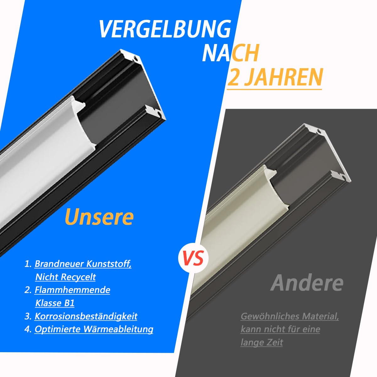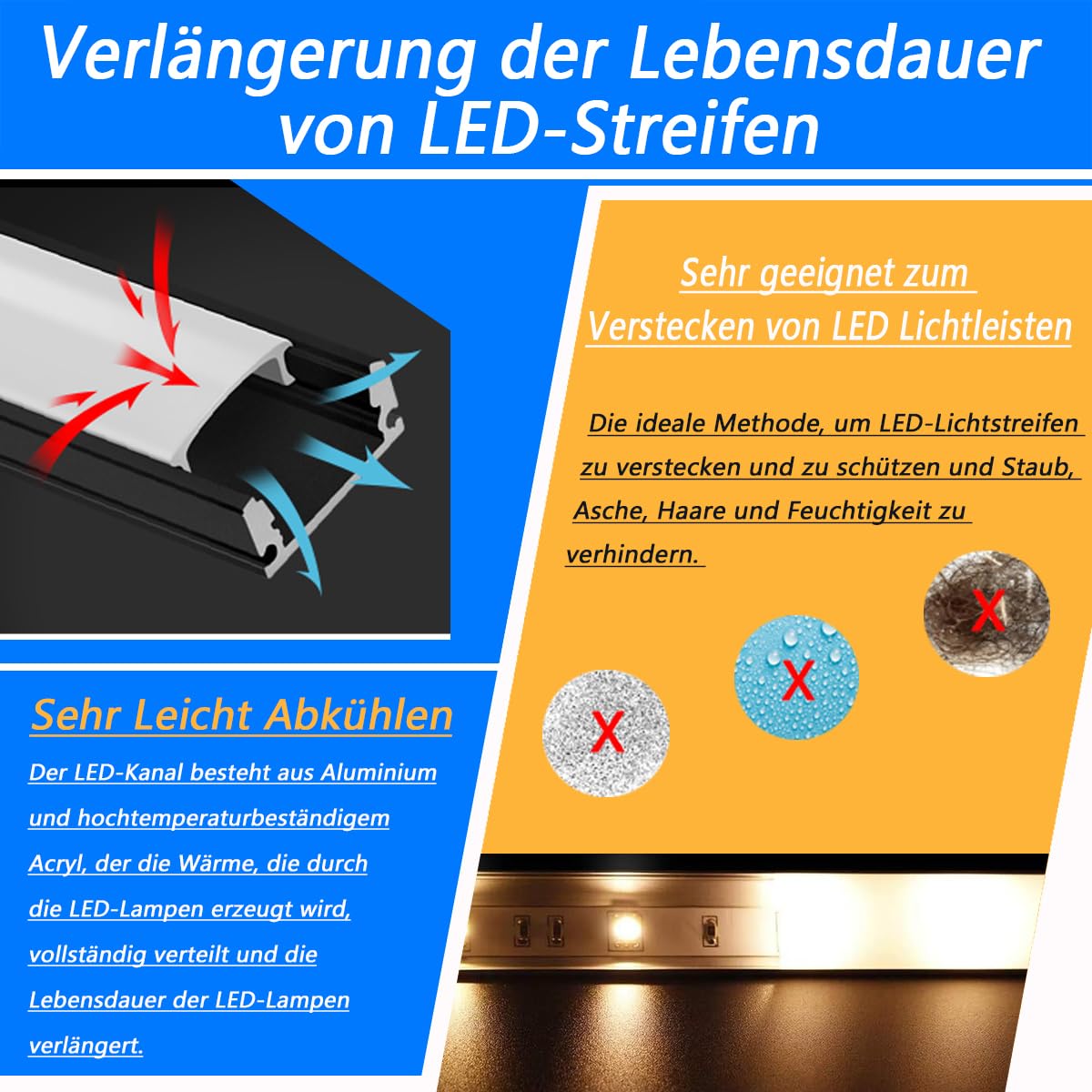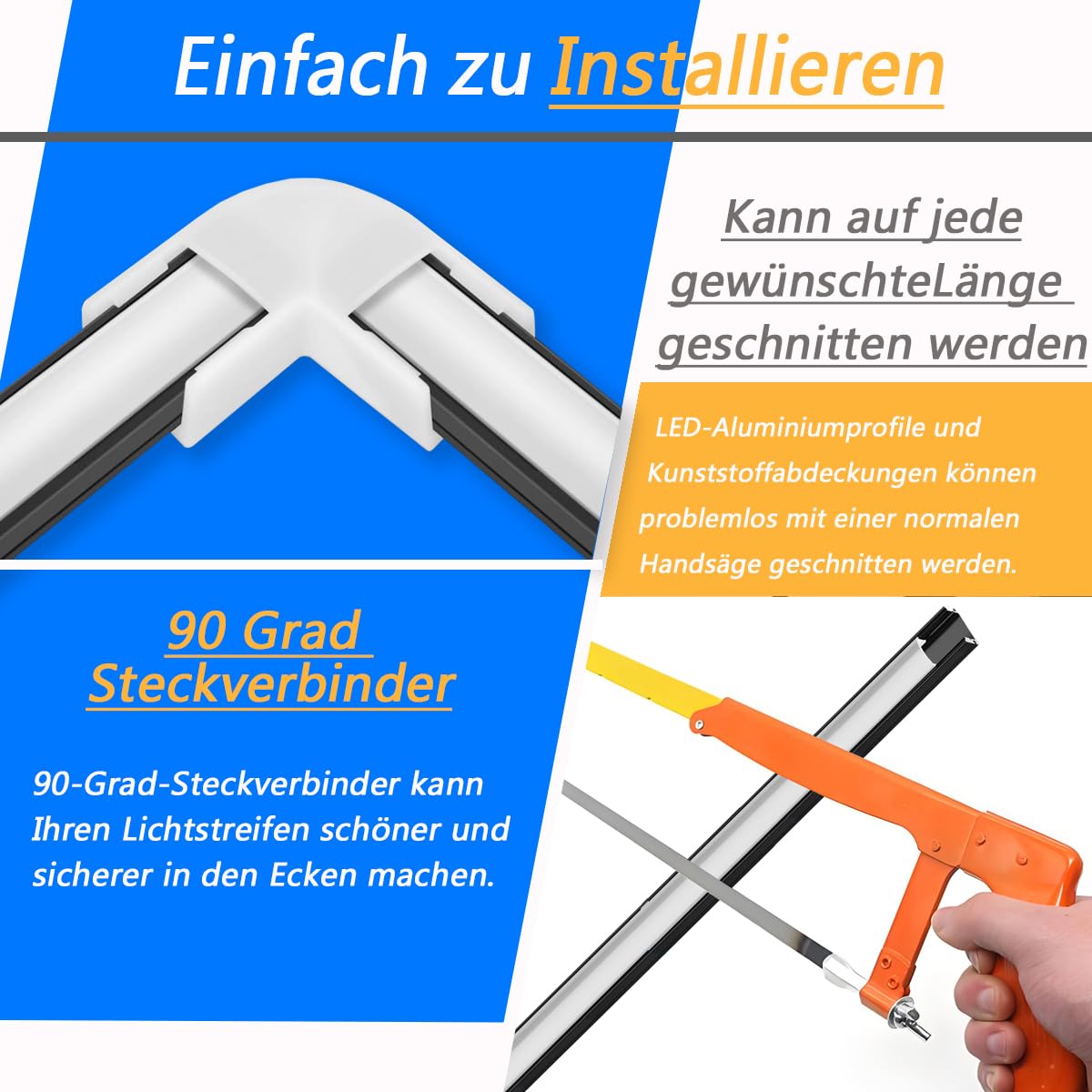 LED Strip Diffuser Easy to Install: No need to buy additional accessories. The 12mm wide LED strip can be easily inserted or glued into the aluminum channel and sealed with a cap! You can shorten the channel to any length with a handsaw or wire saw as needed. Aluminum profile LEDs are suitable for rough or non-adhesive walls and can also be attached to wood with metal mounting brackets or mounting tape."