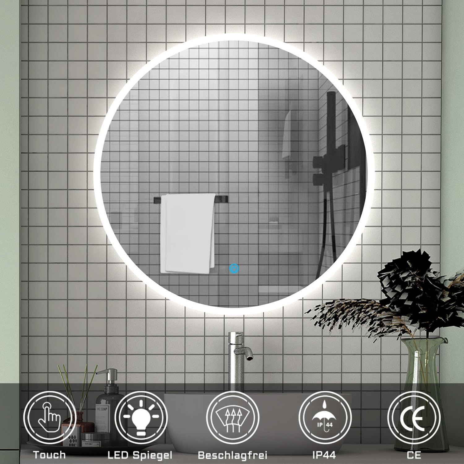 ["Energy-saving round mirror●Touch switch for Cool White LED lighting and Anti-Fog function.","High Quality●All technical specifications comply with EU CE standards.","Timeless Design●With high oxidation resistance, the mirror is suitable for bathrooms, wardrobes, living rooms, and hallways.","Easy Installation●LED mirror ready for electrical connection. Includes mounting kit.","Perfect Reflection●The wall mirror with high-gloss polished edges, perfect light reflection for the optimal mirror image."]