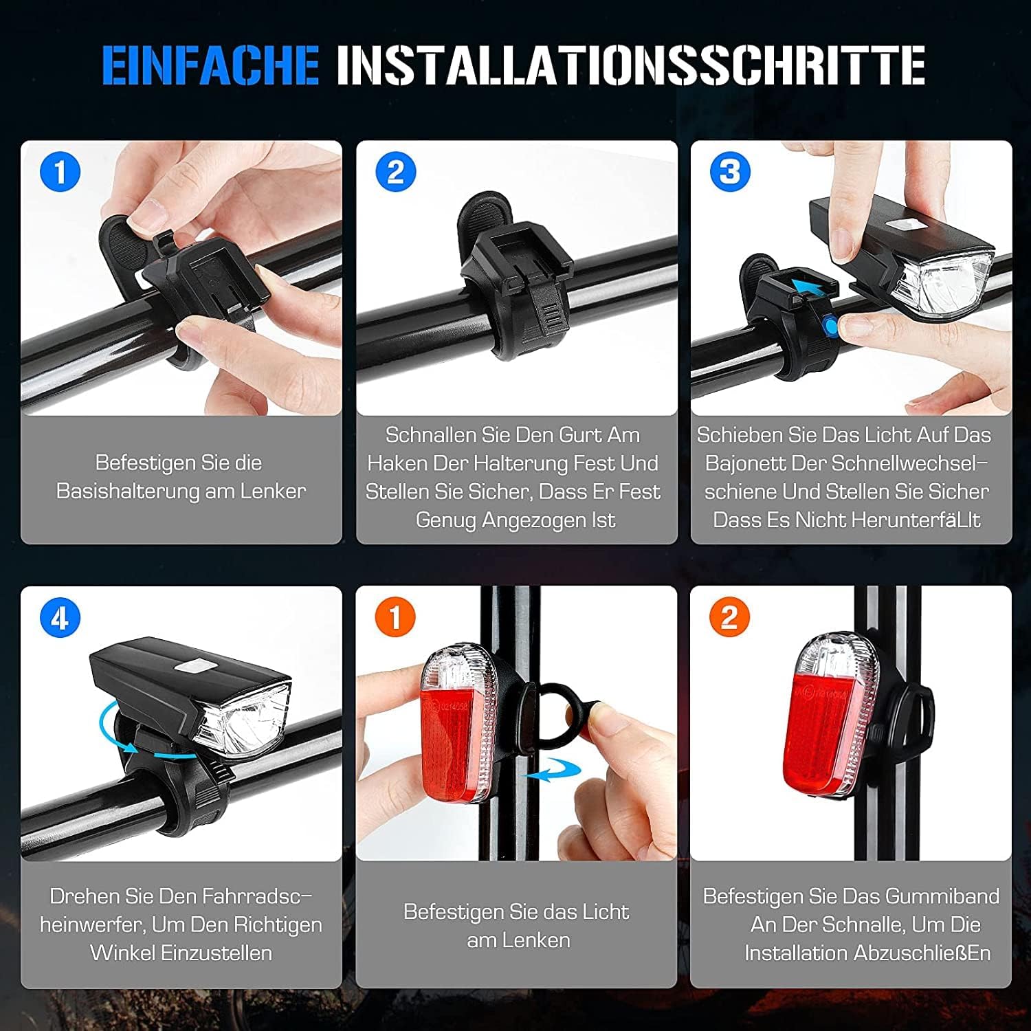 EASY TO INSTALL, QUICK TO REMOVE: Bike light set can be easily detached and attached without tools, without damaging the handlebar, and can also be used as an emergency flashlight. You will receive 1x front light, 1x rear light, 2x charging cables, 1x user manual. If you have any problems with the product, please do not hesitate to contact us, and we will assist you in the best way possible!"