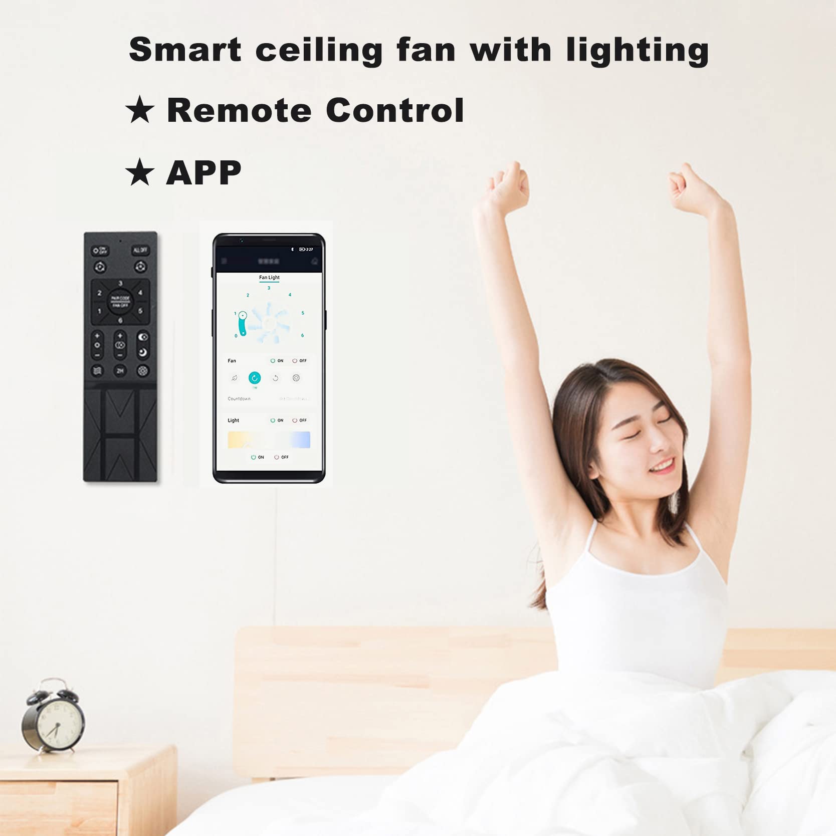 ["Function: Ceiling fan with lighting, Memory function, dimmable (adjustable light color/brightness), night light mode, 6-speed wind speed (reversible), with remote control, APP.","Dimmable: Intelligent LED technology, you can freely set the light color via remote control or APP, 3 light colors (3000 K warm light, 4500 K warm white light, 6000 K white light), Acrylic lampshade, does not harm the eyes, no stroboscope, Soft light.","Quiet ceiling fan: Frequency conversion motor, low noise when working, including 6 gears that can be adjusted in speed and reversed (1-2 stages soft wind, 3-4 stages natural wind, 5-6 stages strong wind).","The ceiling light and the fan have independent button controls, The remote control has multiple working modes for quick adjustment, allowing easy access to ambient light and pleasant breeze at any time.","Lamp: 70x70x12cm/27.56x27.56x4.72in, 48 Watts, Energy efficiency: A; 15w Copper core motor; Material: Acrylic, Iron; AC180-265V; The product has a simple structure, can be disassembled under our guidance, is easy to repair, and is convenient for later maintenance."]