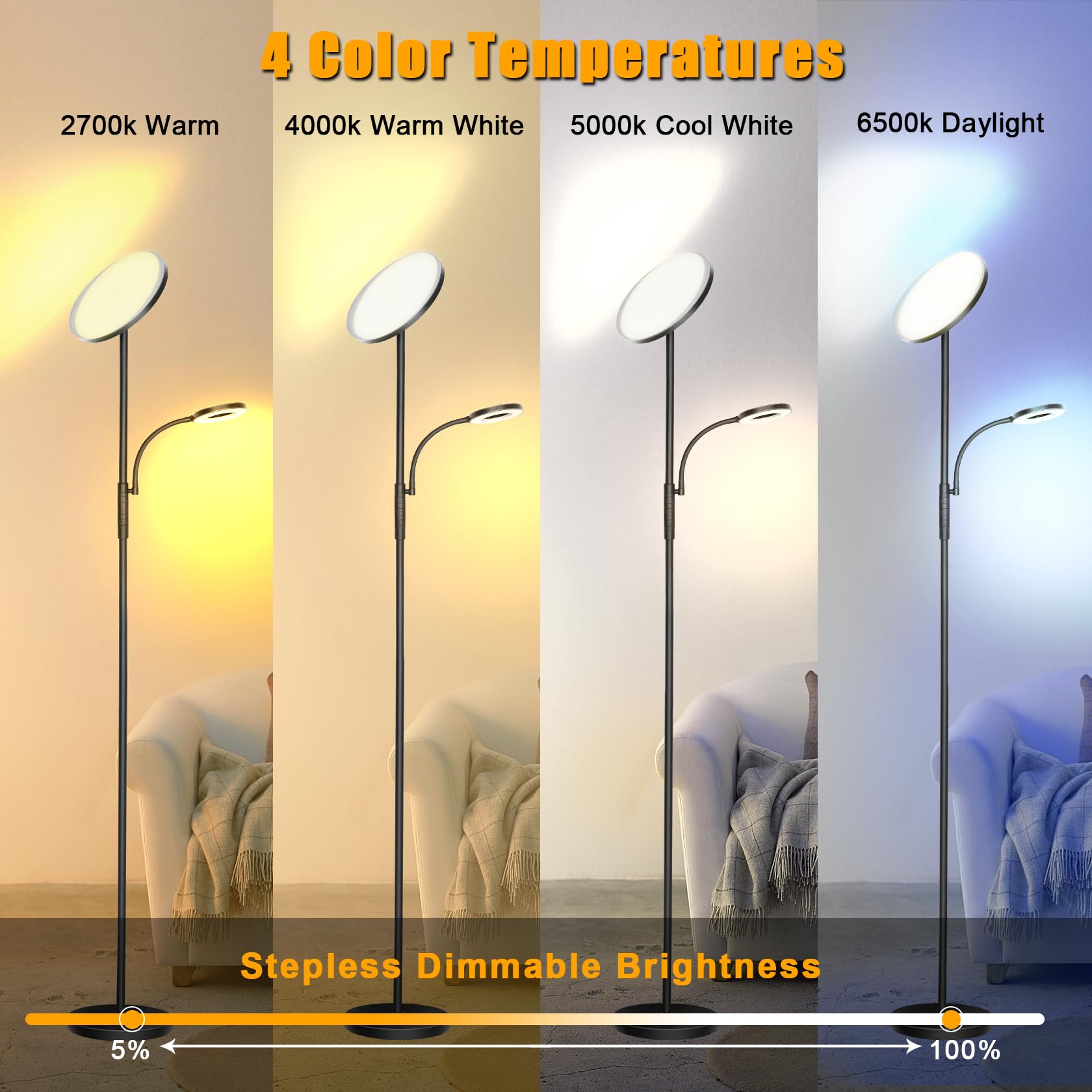 ["42W 3600LM LED Floor Lamp - Your Gentle Companion"] This living room floor lamp features a high-quality 36W LED light with 132 LED chips that illuminates every corner of your room. The reading lamp is fully adjustable (360 degrees) and provides precise lighting for your book or crafts. The main lamp and the reading lamp can be used together or separately, providing versatile lighting options to make your life more comfortable and enjoyable.