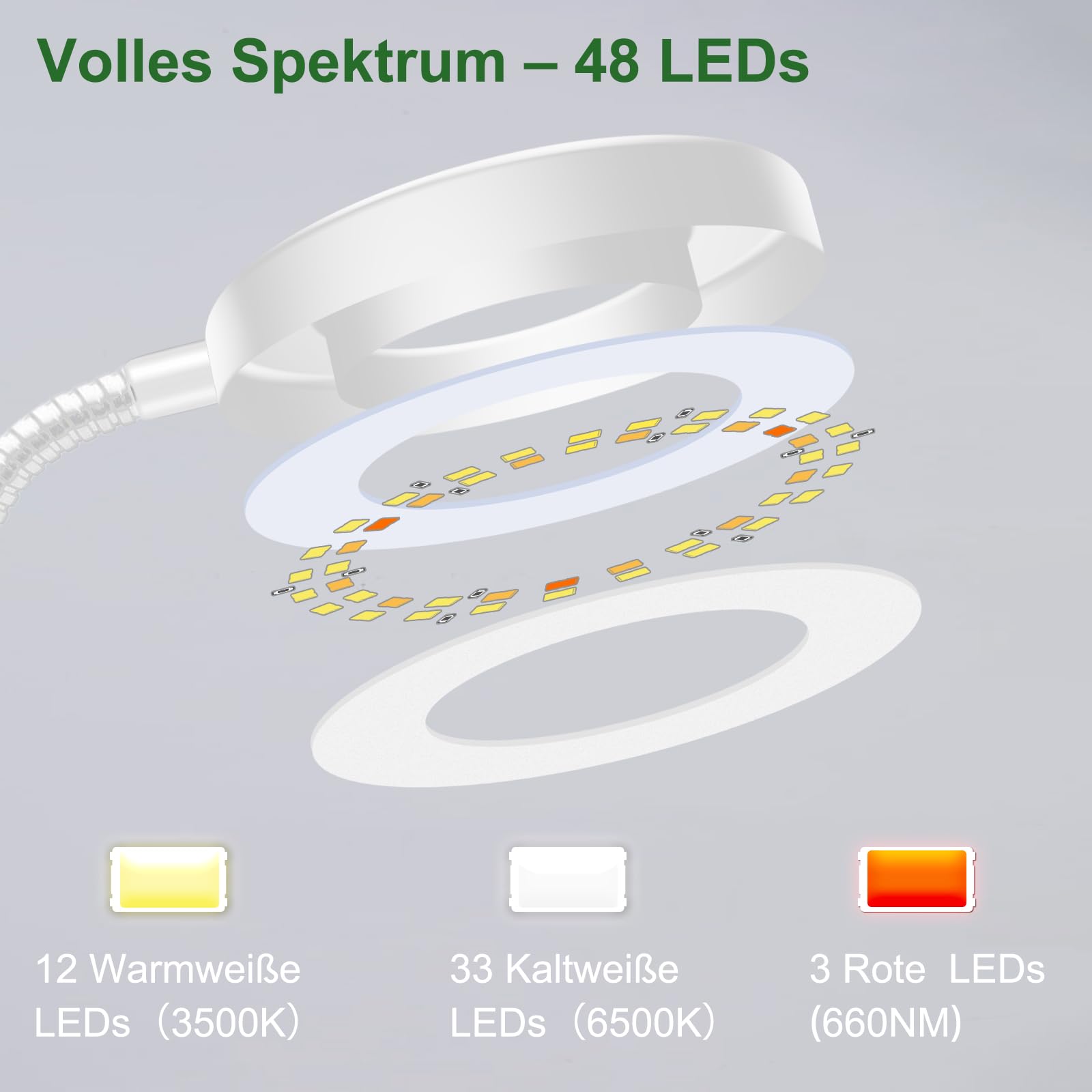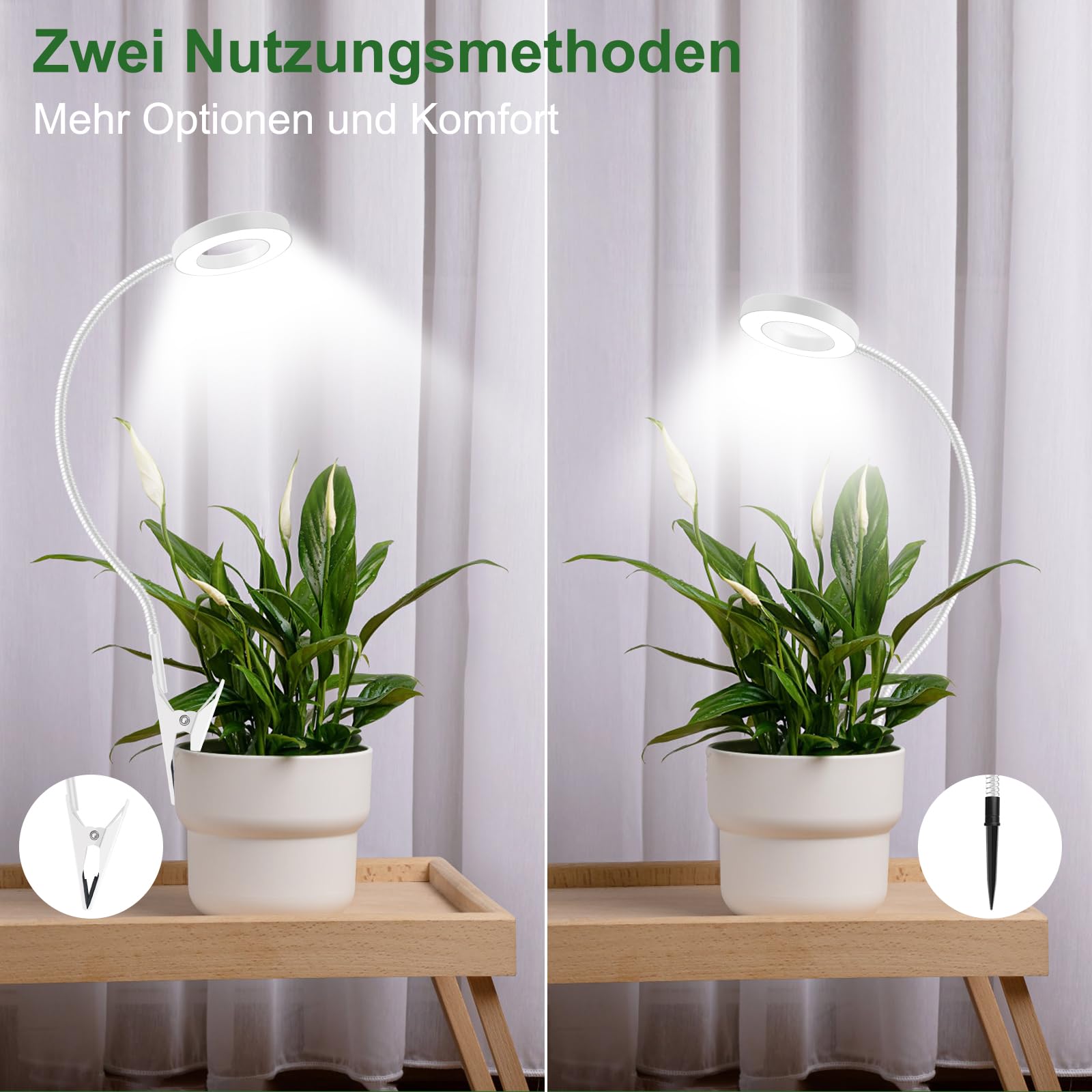 ["Installationsoptionen: This plant lamp can be clipped onto the pot or inserted into the soil, allowing for flexible use without restrictions on the placement location.","Vollspektrum und 3 Belichtungsmodi: With three color temperature options from 660 NM to 6500 K, this LED full spectrum plant lamp can adapt to different plant growth stages and also provide a pleasant view for your eyes.","360° Swivel Neck Design: The grow light features a flexible swan neck design that allows for 360° rotation and optimal light angles for your plants.","6/12/16H Timer, 5 Dimmable Brightness: This plant light offers multiple timer options (6, 12, and 16 hours) and five adjustable brightness levels, giving you full control over the lighting duration and intensity.","Effiziente Wärmeableitung: The LED grow lamp is equipped with an aluminum alloy lamp housing that quickly dissipates heat, ensuring a longer lifespan and safe operation.","Kundensupport: Comprehensive 12-month warranty, lifelong support, and personalized assistance."]