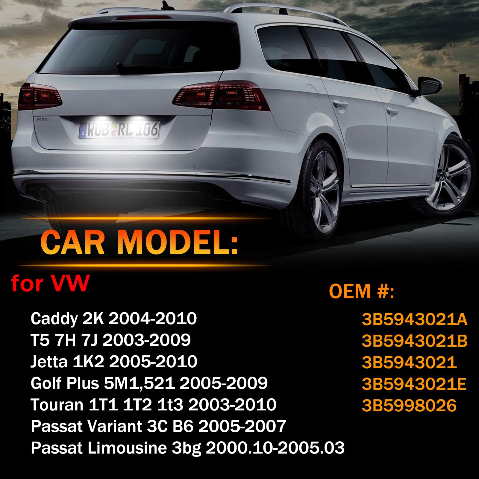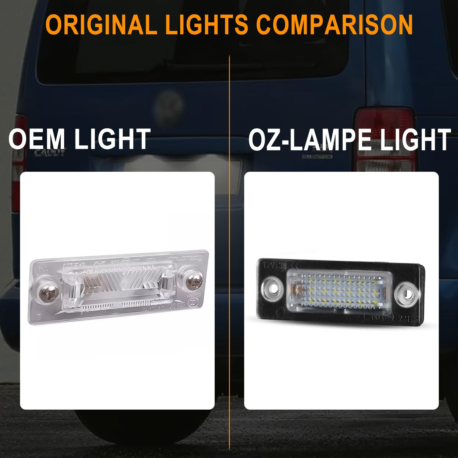 ["Compatible Models】 This LED license plate light is compatible with many VW models, including VW Caddy 2K 2004-2010, Golf Plus 5M1.521 2005-2009, Jetta 1K2 2005-2010, Passat Sedan 3bg 2000.10-2005.03, Passat Variant 3C B6 2005-2007, T5 7H 7J 2003-2009, Touran 1T1 1T2 1t3 2003-2010.【CAN-Bus Design & 100% Error Free】 The OZ-LAMPE license plate lights use an error-free Canbus design to avoid OBC error codes. It features 18 powerful 2835 LED lamp beads and is characterized by low power consumption, energy saving, and environmental protection at the same time.【Easy Installation】 This LED license plate light has an OE socket, plug and play, easy to install, no drilling required. This license plate light provides perfect xenon white light that is sufficient to illuminate the numbers on the license plate.【Certification】 This LED license plate light is RoHS, EMARK, and CE certified, making it a very good product. At the same time, it adopts waterproof material suitable for all kinds of bad weather conditions.【Quality Customer Service】 The OZ-LAMPE LED license plate light has a long lifespan of over 50,000 hours. OZ-LAMPE offers 24-hour customer service and a 1-year warranty. If you have any questions, please feel free to contact us, you can enjoy the best customer service. You need to compare the size and images and the OEM (Original Equipment Manufacturer) to select the correct license plate light for your car."]