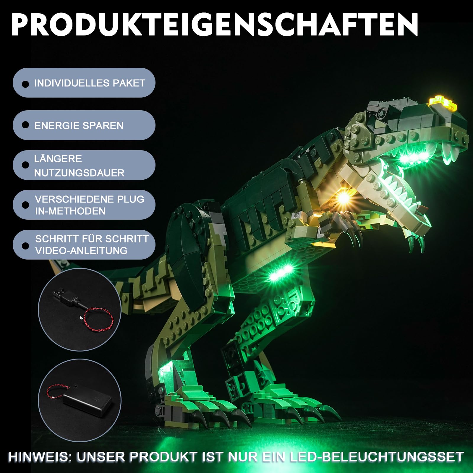 ["【Easy to install】 Specially designed to be compatible with Lego T. Rex. All LEDs have a uniform light pattern and the cable connections fit well together. Our professional light building team provides step-by-step video or PDF installation instructions to make installation easier for you.","【Enjoy creative DIY fun】 Our LED light kit for 31151 Creator T.Rex provides bright lighting to help you relax from your busy life and regain your beautiful night. The light set is perfect for model enthusiasts to personally upgrade their blocks and further develop their models while enjoying the fun of DIY.","【Multiple power supply options】Package comes with USB cable and battery box. The LED lights for 31151 can be powered by a power bank/wall charger/USB socket/laptop/other device with USB port. You can also use it with batteries (batteries not included).","【Safe user experience】Our decoration light set for T.Rex 31151 is made of high-quality copper wires. With heat and burn resistance, you can extend the lifespan. 5V low voltage ensures a safer experience.","【Ideal gifts and charming presentation】This LED lighting set is a great gift for birthdays, Christmas, New Year, Children's Day, graduation, Thanksgiving, or Valentine's Day for any model-building enthusiast. It can brighten up your bricks in the dark and make models into a charming presentation in the showroom, on the storage shelf, or on the table."]