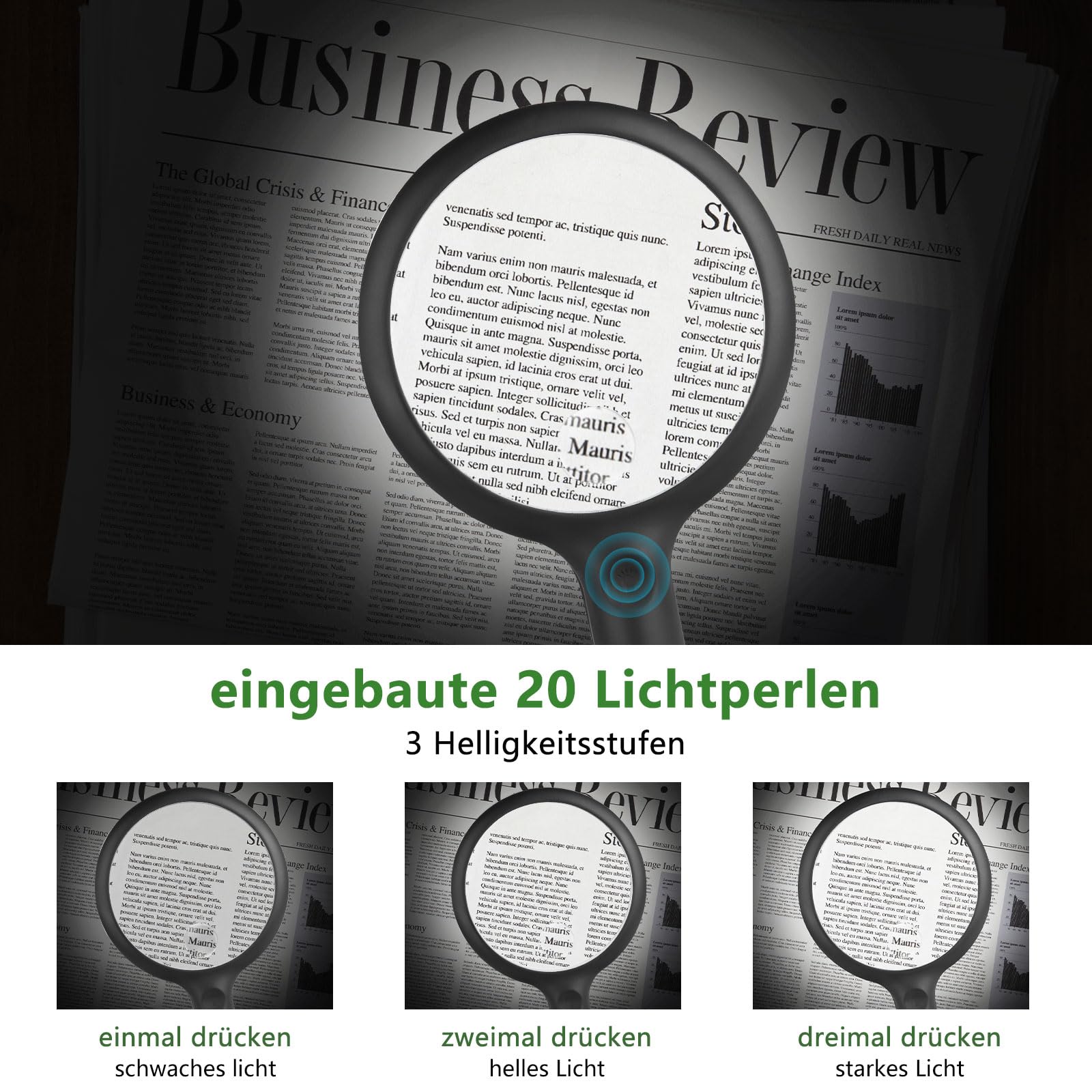 ["Magnifying glass with 3 different light intensities"] Our magnifying glass with light has 3 brightness levels of natural light to cover your different lighting needs in different environments. Compared to light beads with stripes for coverage, our light beads without cover stripes are much brighter. This magnifying glass with light is perfect for reading, drawing, puzzles, crafts, repairing electronics, making jewelry, or for other professional purposes.