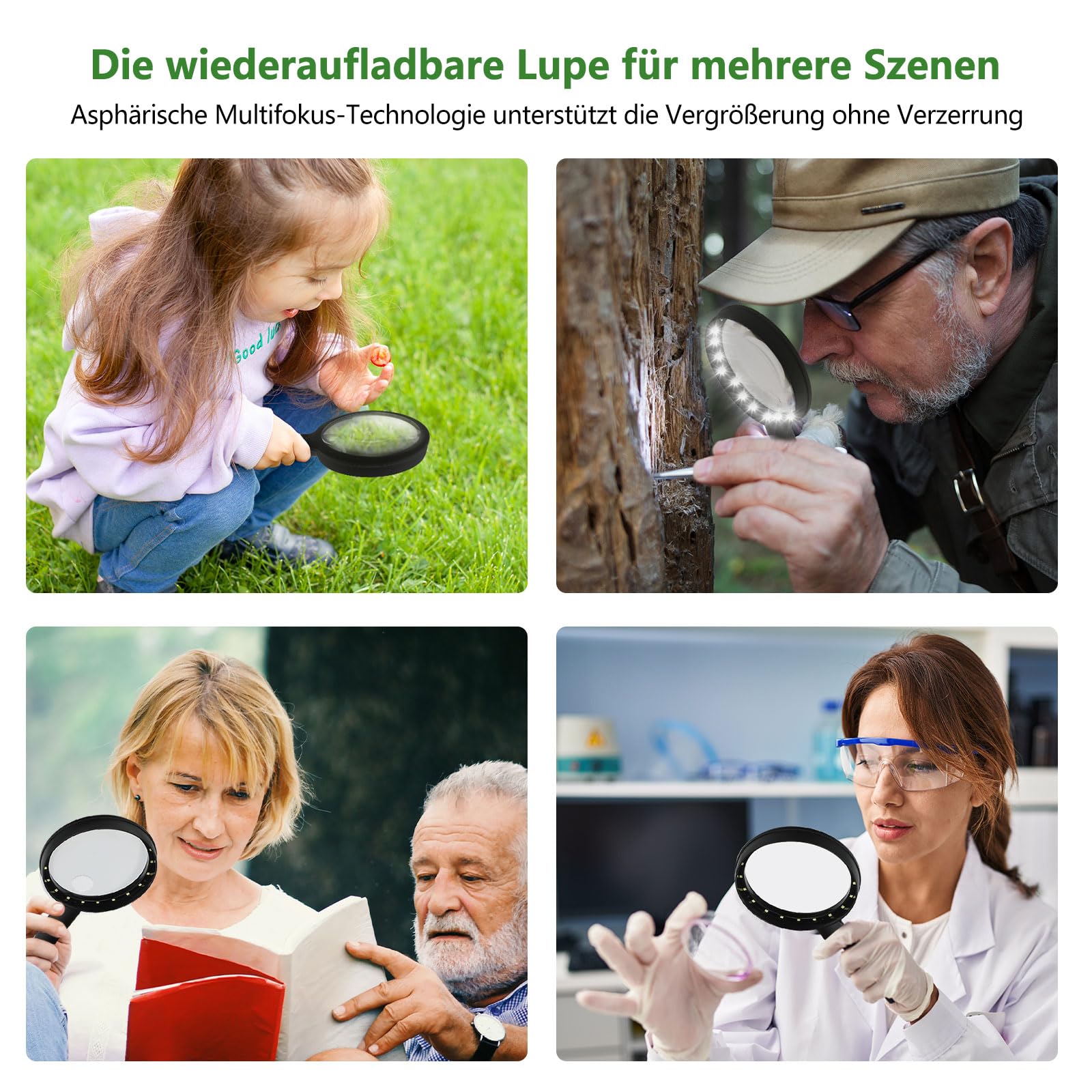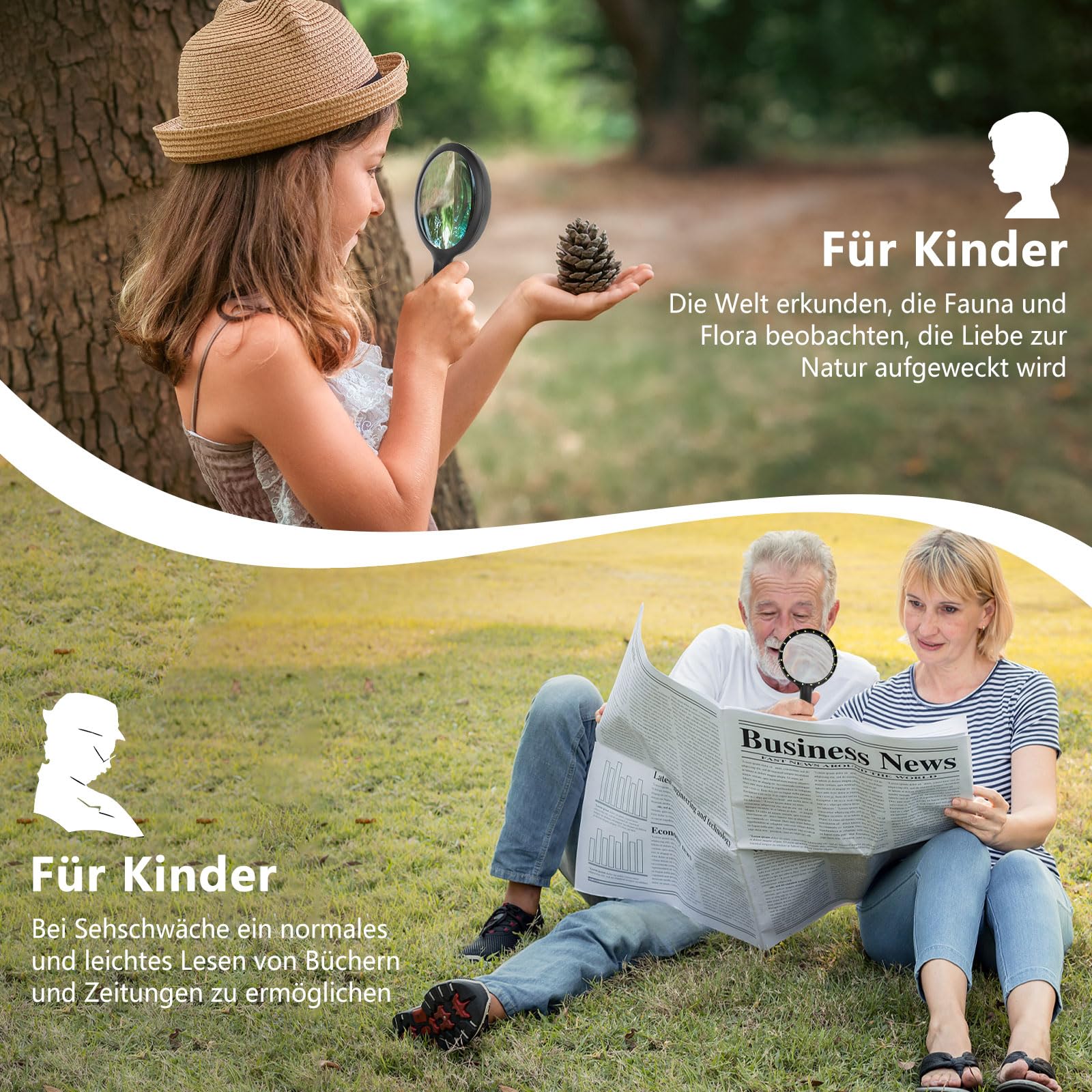 ["Hand magnifying glass with 30x magnification and 60x auxiliary lens"] This senior magnifying glass is made of high-quality optical PMMA glass, which provides extremely high resolution and is scratch-resistant. The main lens offers optical magnification of up to 30 times without distortion. This hand magnifier with LED is suitable for older adults and children, especially as a reading aid for seniors or people with macular degeneration or visual impairment.