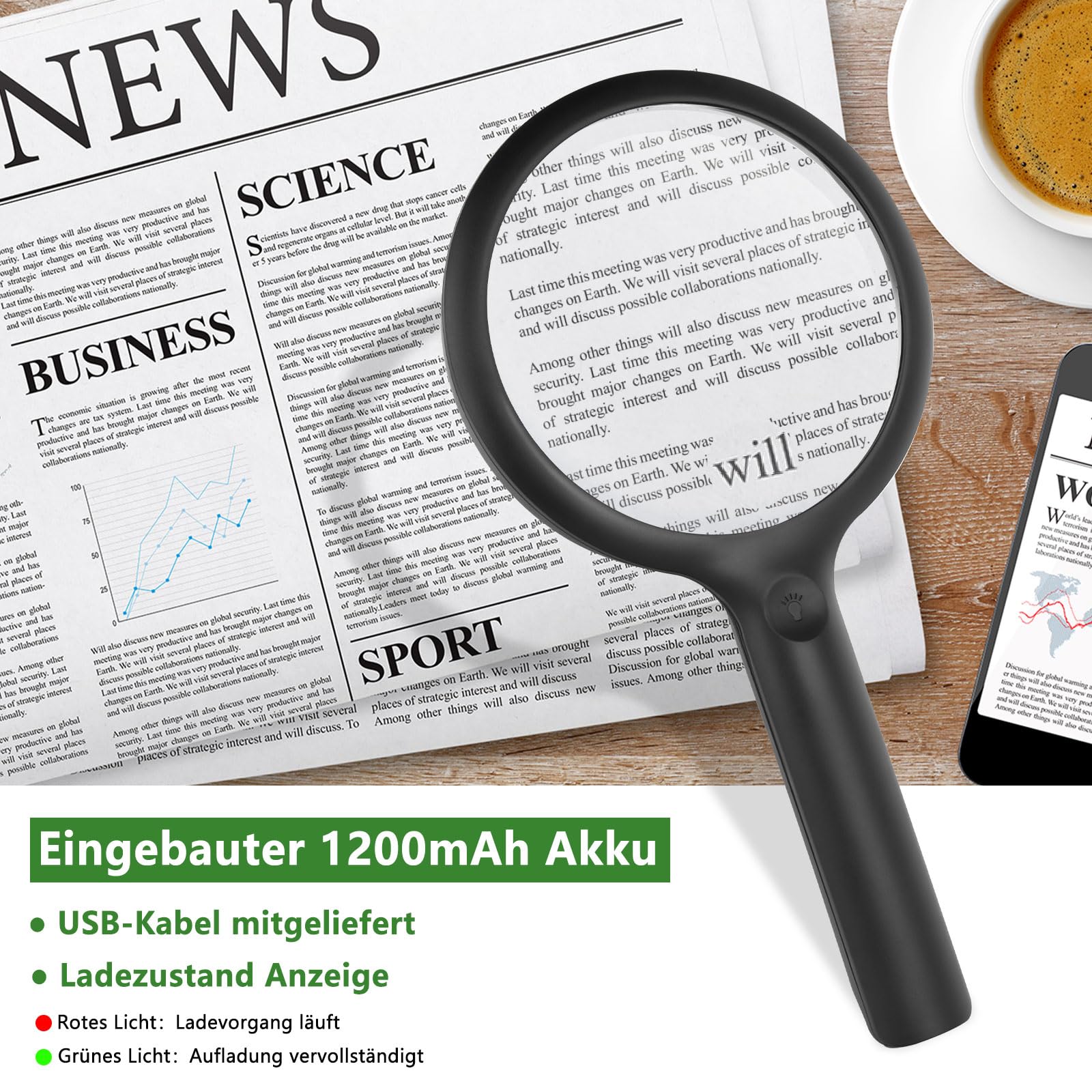 ["Perfect gift for visual impairment"] This magnifying glass with light is well-designed and versatile for observation, repair, handicrafts, puzzles, and other hobbies. It is perfect for reading small print on coupons, prescriptions, and can serve as a magnifying glass for visual impairment. Delivery includes magnifying glass, USB cable, lens cloth, user manual.
