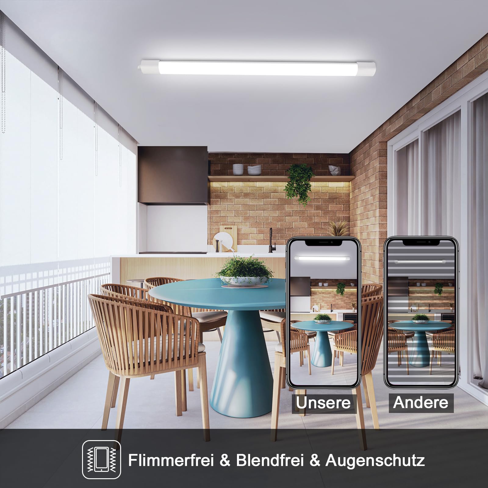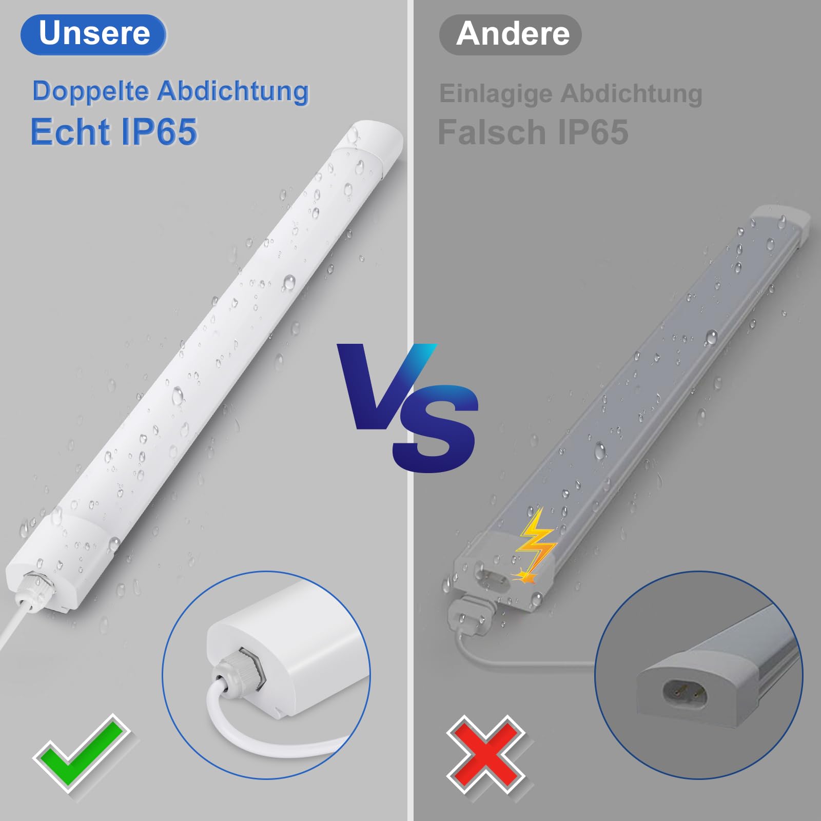 ["【Energy-saving and durable】: The 60cm LED moisture-proof luminaire uses the latest environmental protection technology. The light output is up to 110LM/W. LED tube st Alternative to traditional 200W incandescent lamps or 60W fluorescent lamps, saving more than 90% on electricity costs.","【IP65 Waterproof】: Due to the high protection class IP65, this moisture-proof LED luminaire has extremely high dirt and water resistance and is particularly suitable as LED lighting for rooms with higher humidity. All-in-one connection (the lamp head comes with a pre-installed, non-removable cable), simply connect the wires! and can be moisture resistant","【Flicker-free and glare-free】LED workshop ceiling lights illuminate in a wide angle of 120° to fully illuminate the room. The milk white housing creates homogeneous, glare-free light with high-quality LEDs, and the absence of flicker, glare, and buzzing prevents eye strain and discomfort","【CRI>80/More realistic color reproduction】: The color rendering index of up to RA80+ perfectly reproduces the actual color. It has high light transmittance, the light is evenly distributed and soft in the room, even if you look directly at it, it will not be dazzling or blinding, which can protect the eyes well","【Wide range of applications】Simple and beautiful design suitable for outdoor and indoor areas, thanks to the excellent quality of the LED tubes, you can install them in almost any location, such as kitchens, hallways, basements, workshops, warehouses, offices, factories, parking lots, carports, technical rooms, workbenches, hobby rooms, dressing rooms, storage rooms, courtyard, shop, exterior wall, balcony, farm, etc","【Easy installation】LED batten light only needs to be fixed to the wall or ceiling with a screwdriver and the luminaire can then be clipped into the bracket. This installation method is very simple and can be done by one person without the help of an electrician"]