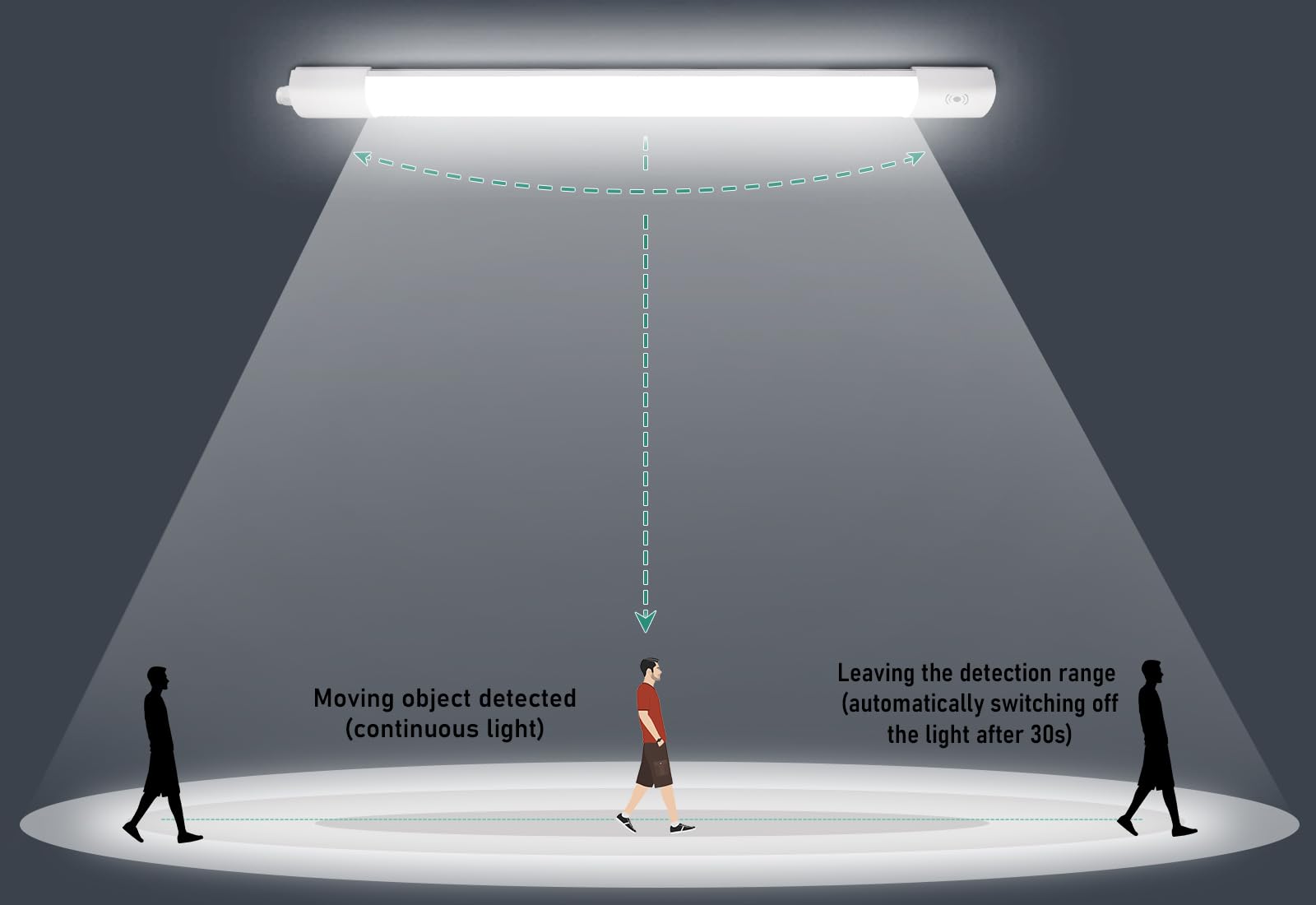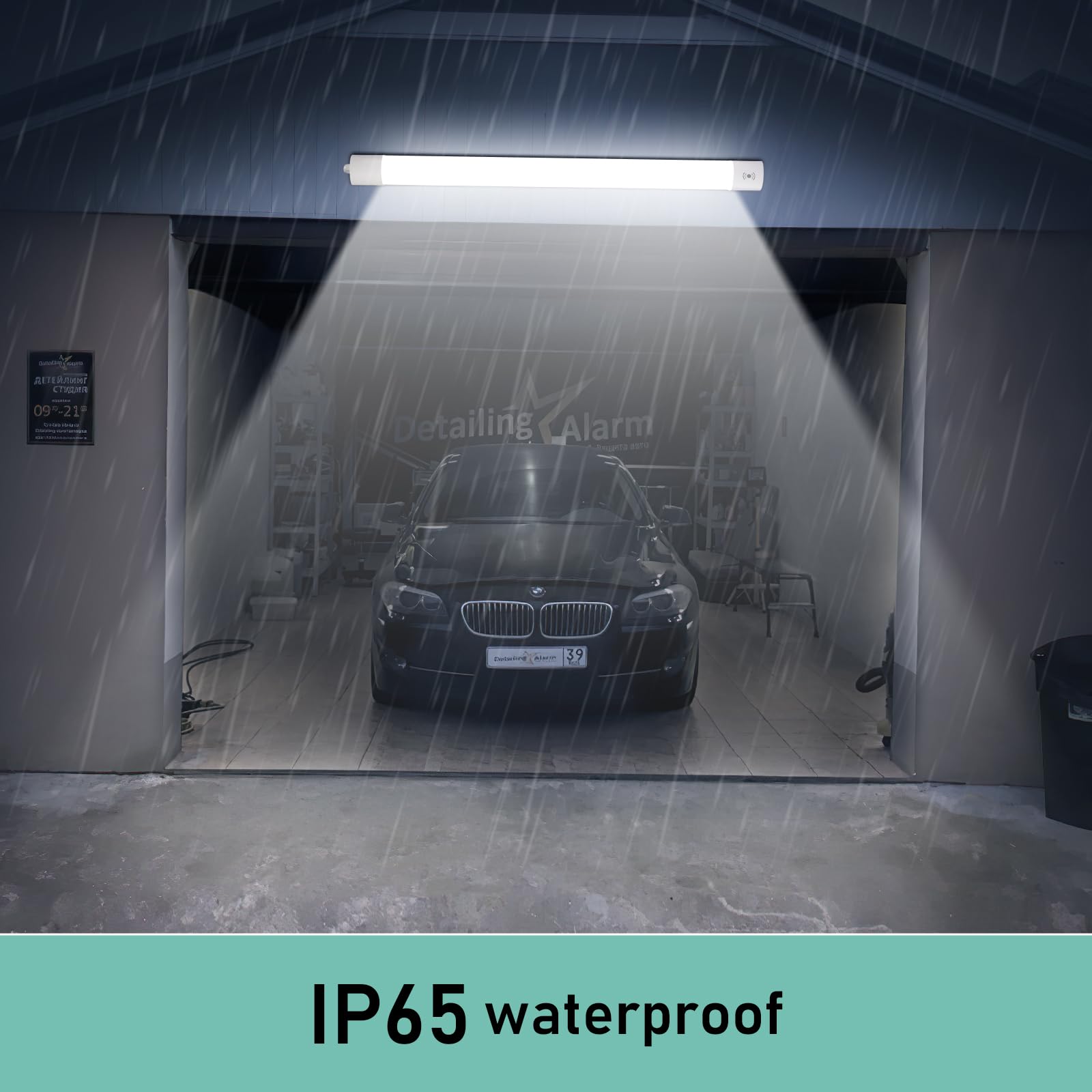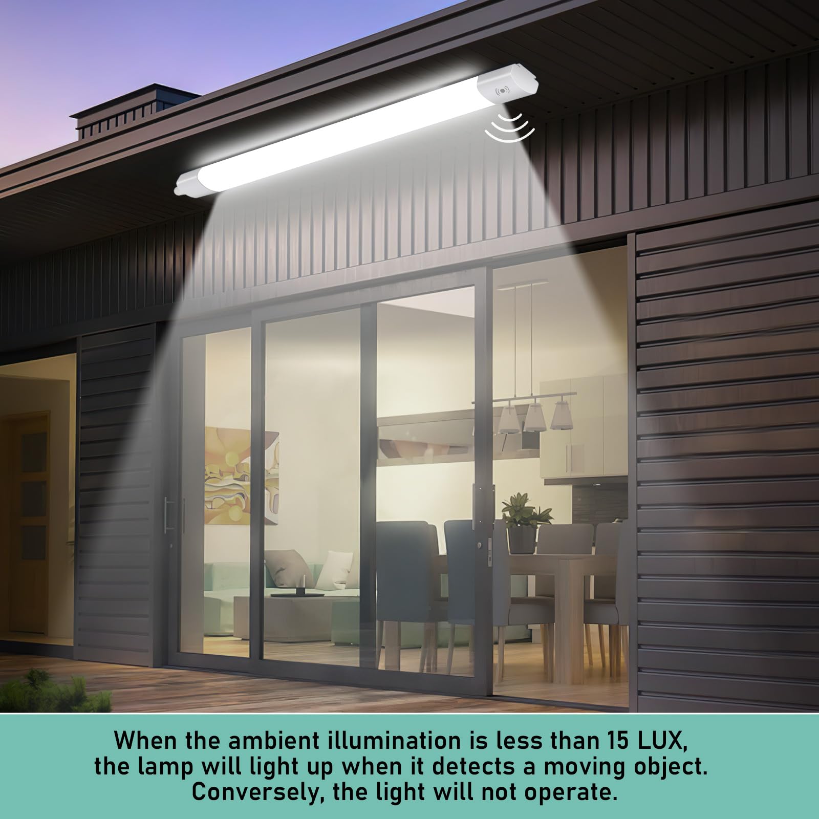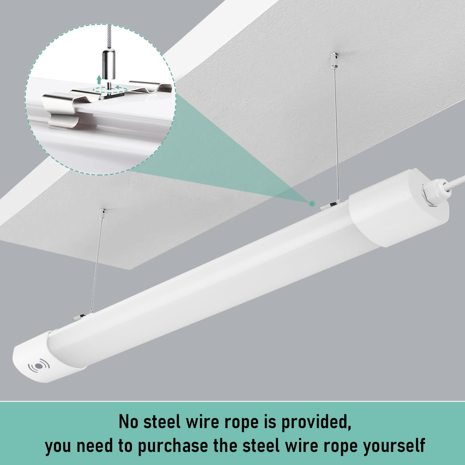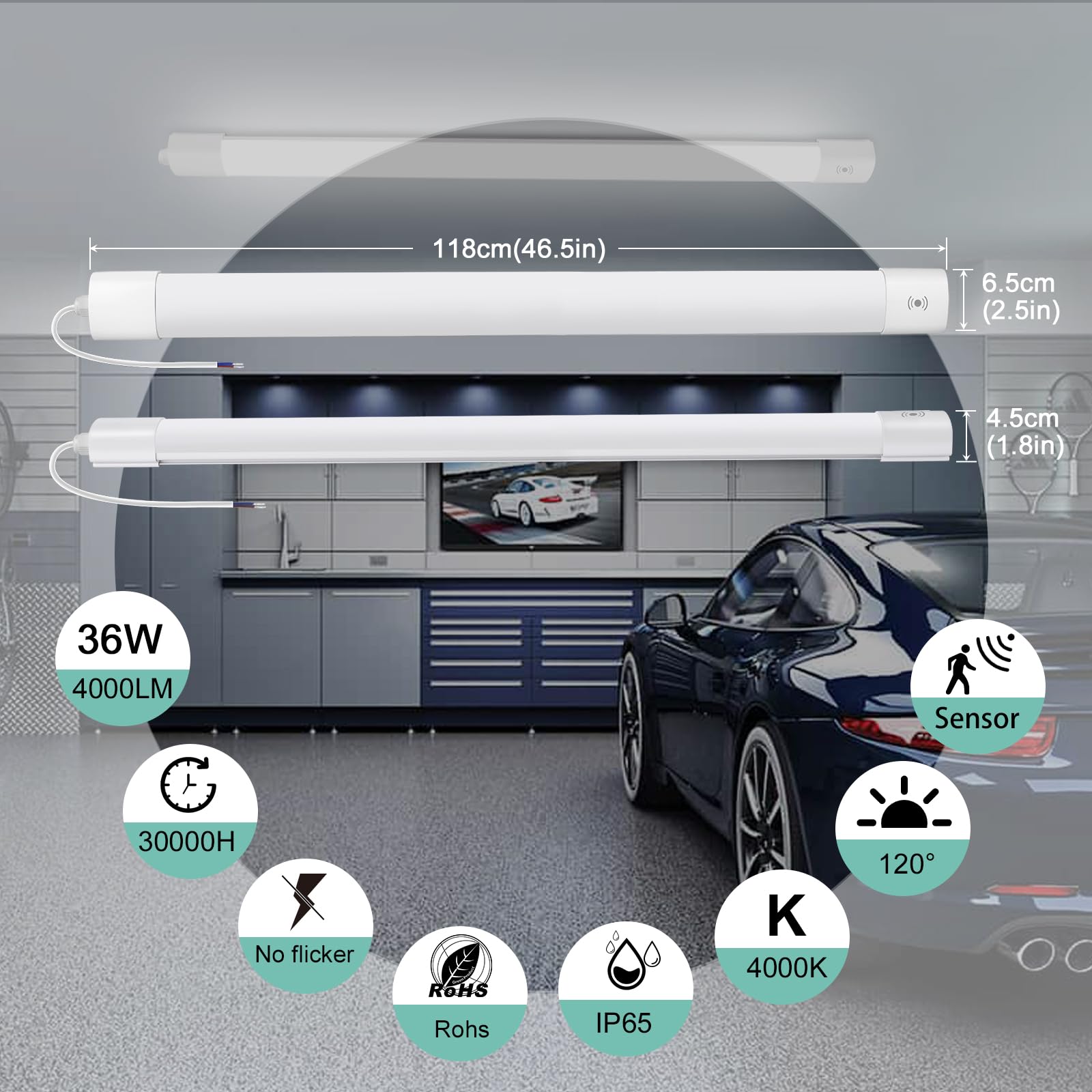 ["đȘă36W LED Feuchtraumleuchte mit BewegungsmelderăDetection range: 13-16ft, Light sensitivity: 30lux. In an environment with a brightness of less than 30Lux, the LED light detects the movement as soon as a moving person or pet is detected within 13-16ft. The induction light will light up for 30 seconds with 100% brightness.","đȘăEnergy saving and durableă: The 120cm LED moisture-proof light uses the latest environmental protection technology. The light output is up to 110LM/W. LED tube st alternative to traditional 300W incandescent bulbs, saving more than 90% on electricity costs.","đȘăIP65 Waterproofă: Due to its high IP65 protection class, this LED moisture-proof light has extremely high dirt and water resistance and is particularly suitable as LED lighting for rooms with higher humidity. All-in-one connection (the lamp head is supplied with a pre-installed, non-removable cable), simply connect the wires! and can be moisture resistant","đȘăFlicker-free and Glare-freeăLED workshop ceiling lights illuminate in a wide angle of 120° to fully illuminate the room. The milk white housing produces high quality LEDs that emit homogeneous, glare-free light, and the absence of flicker, glare, and humming prevents eye strain and discomfort","đȘăCRI>80/More realistic color reproductionă: The color rendering index of up to RA80+ perfectly reproduces the actual color. It has high light transmittance, the light is evenly distributed and soft in the room, even if you look directly at it, it will not be dazzling or glaring, which can protect the eyes well","đȘăWide range of applicationsăSimple and beautiful design suitable for outdoor and indoor areas, Thanks to the excellent quality of the LED tubes, you can install them in almost any location, such as kitchens, corridors, basements, workshops, warehouses, offices, factories, parking lots, carports, control rooms, workbenches, hobby rooms, changing rooms, storage rooms, courtyard, shop, exterior wall, balcony, farm, etc","đȘăEasy installationăLED ceiling light just needs to be mounted on the wall or ceiling with a screwdriver and the light can then be clipped into the bracket. This installation method is very simple and can be done by one person without the help of an electrician"]