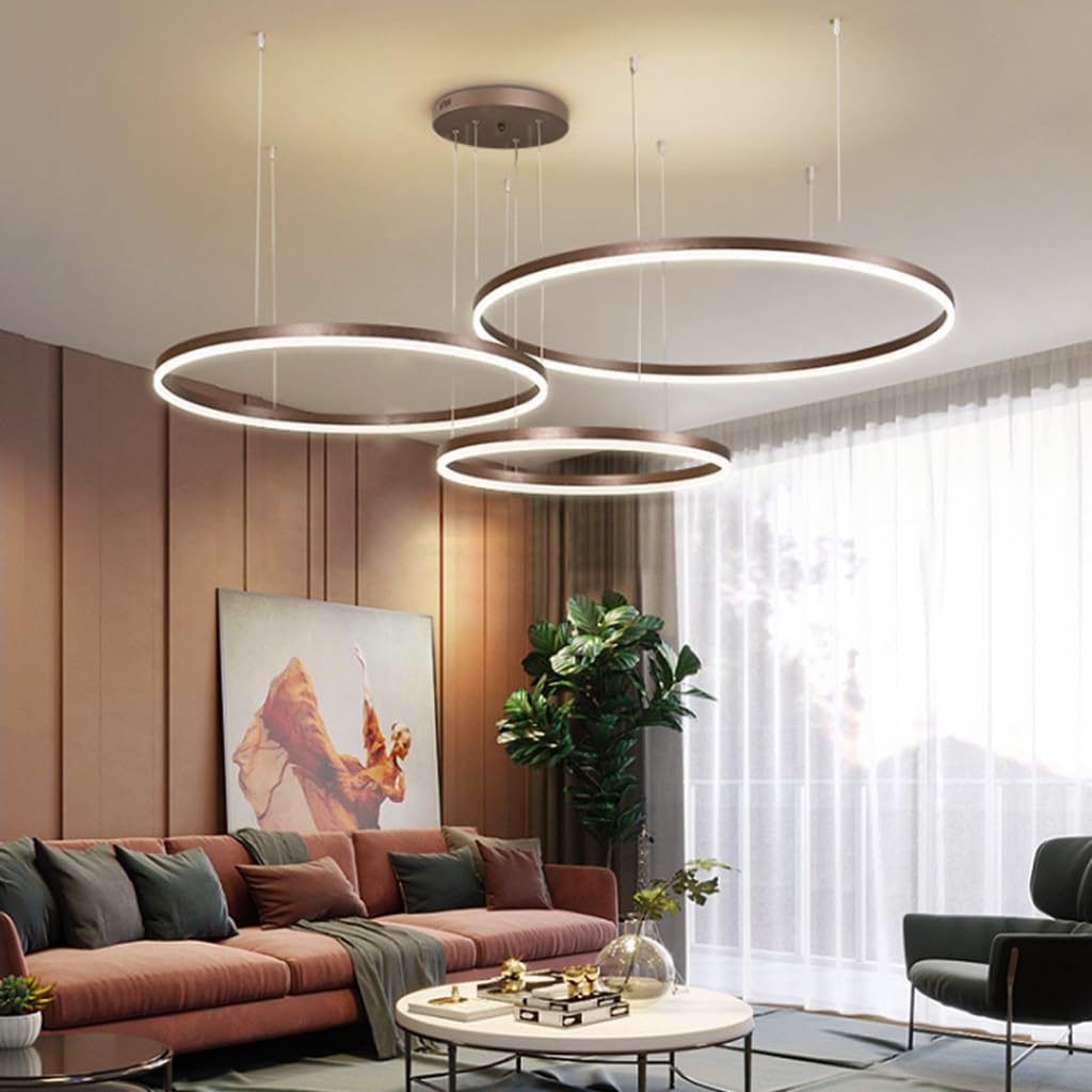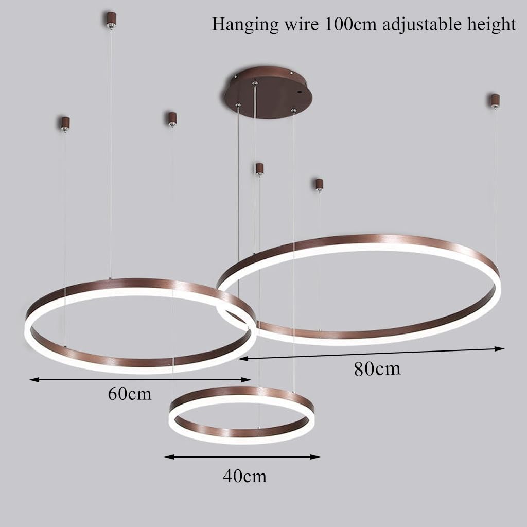["★ Appearance: Creative circular combination design, 3 height-adjustable LED lights integrating art and modern aesthetics. With its charming appearance, it is also the true highlight of the day. The bright light source creates a charming atmosphere and elegance, and its unique design is eye-catching, perfectly matching modern design, making your home warmer and more romantic.","★ Size: The diameter of the three rings is 15.75 inches + 23.62 inches + 31.50 inches, and the 39.37 inches suspension wire can be easily adjusted to different heights. Material: brushed metal, high-quality aluminum shell and acrylic lampshade, painted surface, easy to clean, with better heat dissipation, including all installation hardware and instructions, quick installation, Color: gold/brown","★ Built-in LED light source, compared to traditional energy-saving lamps or LED lights, brightness 5% -100%, 3C certification, Voltage: 220-240V, Power: 90W, Lifetime up to 78000 hours","★ Scene: Restaurant, bedroom, living room, kitchen, cafe, store, attic, villa, office, library, dining table, hotel, kindergarten, club, storage room, balcony, etc. Adding color to any space, creating an elegant and warm atmosphere, making it an ideal choice for home lighting and also the first choice for decorative lighting. It can attract attention in any room and has a relaxing color and light effect","★ Service: Your satisfaction is our greatest goal. We strive to provide our customers with the best service. If you have any questions about this product, please feel free to contact us via email. Due to the time difference, we will definitely respond within 24 hours and provide you with a perfect solution, so that you have a perfect shopping experience until you are satisfied"]