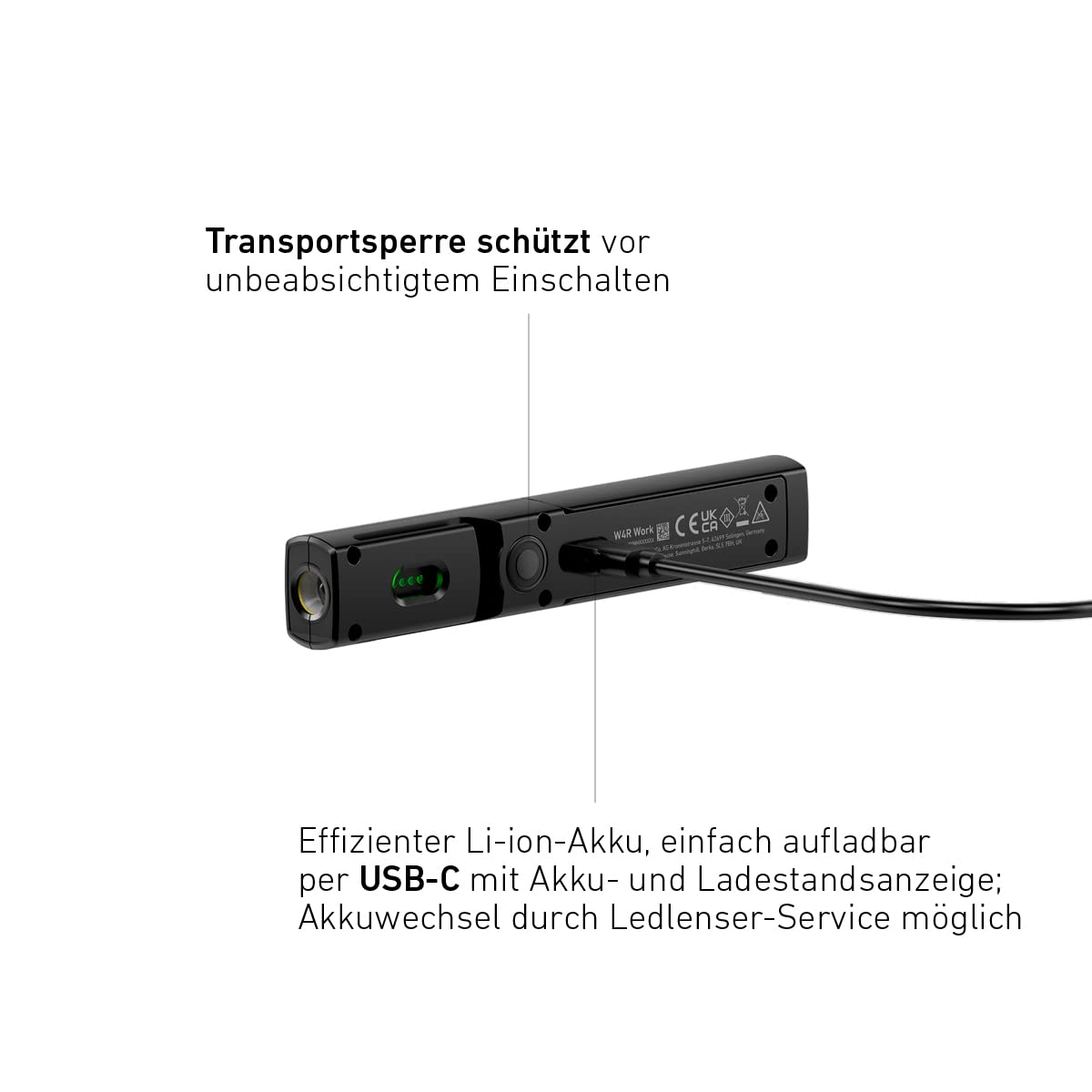 ["Versatile illumination: The W4R Work Tool Flashlight offers broad or pinpoint lighting for any workshop requirement with two light sources and selectable modes (Flood/Spot)","Homogeneous premium light pattern: The premium light pattern of the Ledlenser W4R work light provides precise and uniform illumination, ideal for detailed work and thorough inspections","Robust, grippy, durable: LED lamp with plastic housing and textured surface for easy handling and durability, including a practical clip","Transport lock for safety: The transport lock on the rechargeable Ledlenser W4R workshop lamp prevents accidental activation, ensuring safe storage on the go","Efficient Li-ion battery: The LED work light is rechargeable via USB-C with battery level indicator. Battery replacement possible through Ledlenser service. 220 lumens and an impressive 9 hours of runtime"]