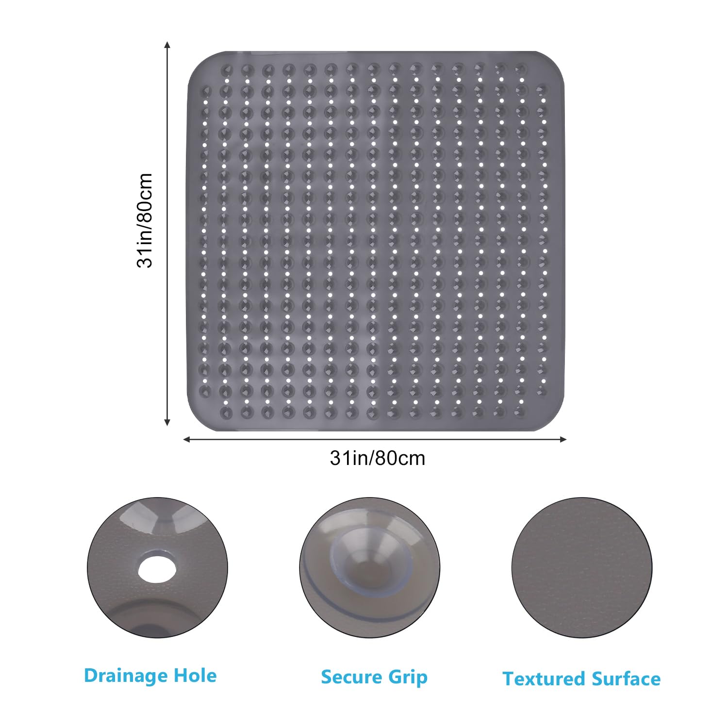 ["🚿【High Quality Material】The shower mat is made of odorless, skin-friendly, and safe PVC material, free of toxic and harmful substances and chemical odors. Heavy-duty, standard size, and square make it lay flat on any smooth bathroom floor.","🚿【Durable and Non-Slip】The rounded design with an elevated pebble-like surface allows you to enter the shower without slipping on the soles of your feet, and the 285 suction cups on the bottom of the non-slip shower mat keep the mat securely fixed on the bathroom floor, providing 360-degree slip protection for the user.","🚿【Easy to Clean】The shower mat is machine washable for easy maintenance. Simply toss the bath mat in the washing machine and it will look like new after each wash. Or simply brush and rinse with water, then air dry, and it will look like a new mat.","🚿【Multifunctional Utility】The rounded design with an elevated pebble-like surface allows you to enter the shower without slipping on the soles of your feet, and 285 suction cups on the bottom for essential anti-slip function. Meanwhile, the large shower mat measures 80cm x 80cm for excellent coverage and has numerous drainage holes to keep the shower mat dry at all times.","🚿【Quick Drying & Mold Prevention】After using the bathroom, water drains out of the drainage holes of the shower mat, there are 176 drainage holes on the shower mat for easy drainage, allowing the shower mat to dry quickly, achieving optimal drying results and better preventing mold and mildew.","🚿【Wide Applications】This shower mat is the best choice for homes, gyms, spas, hotels, and more. This bath mat provides excellent protection for your children, elderly, pregnant women, and family members. The bath mat can only adhere to clean, smooth floors."]