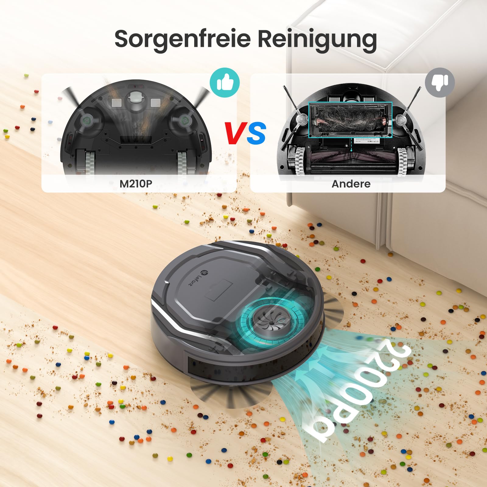 LEFANT M210PG robot vacuum with 2200 Pa, WiFi, compatible with Alexa and app control, 120 min runtime, optimized for carpets, pet hair, and hard floors with charging dock.