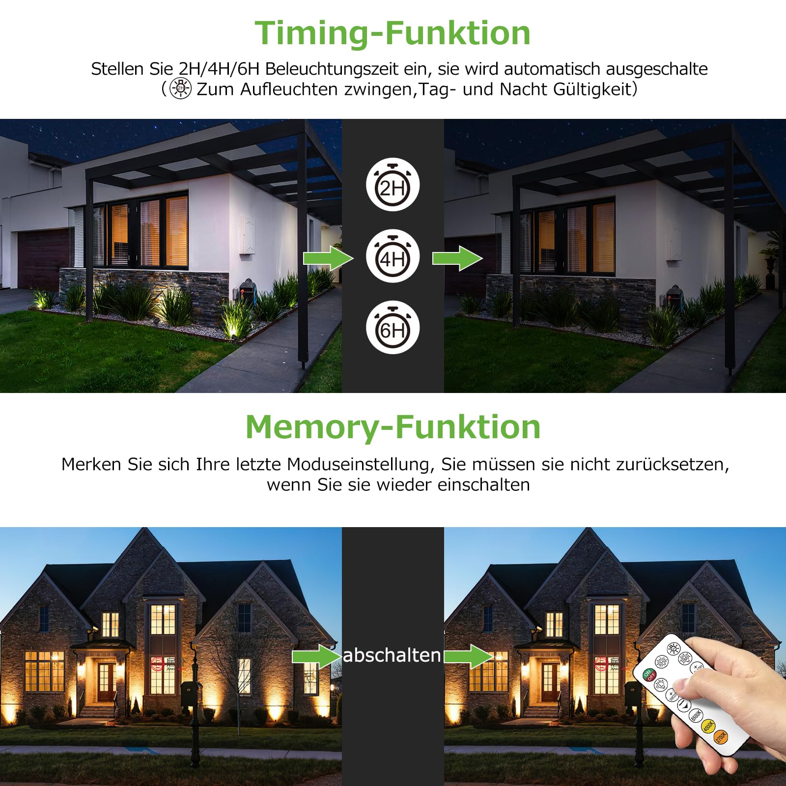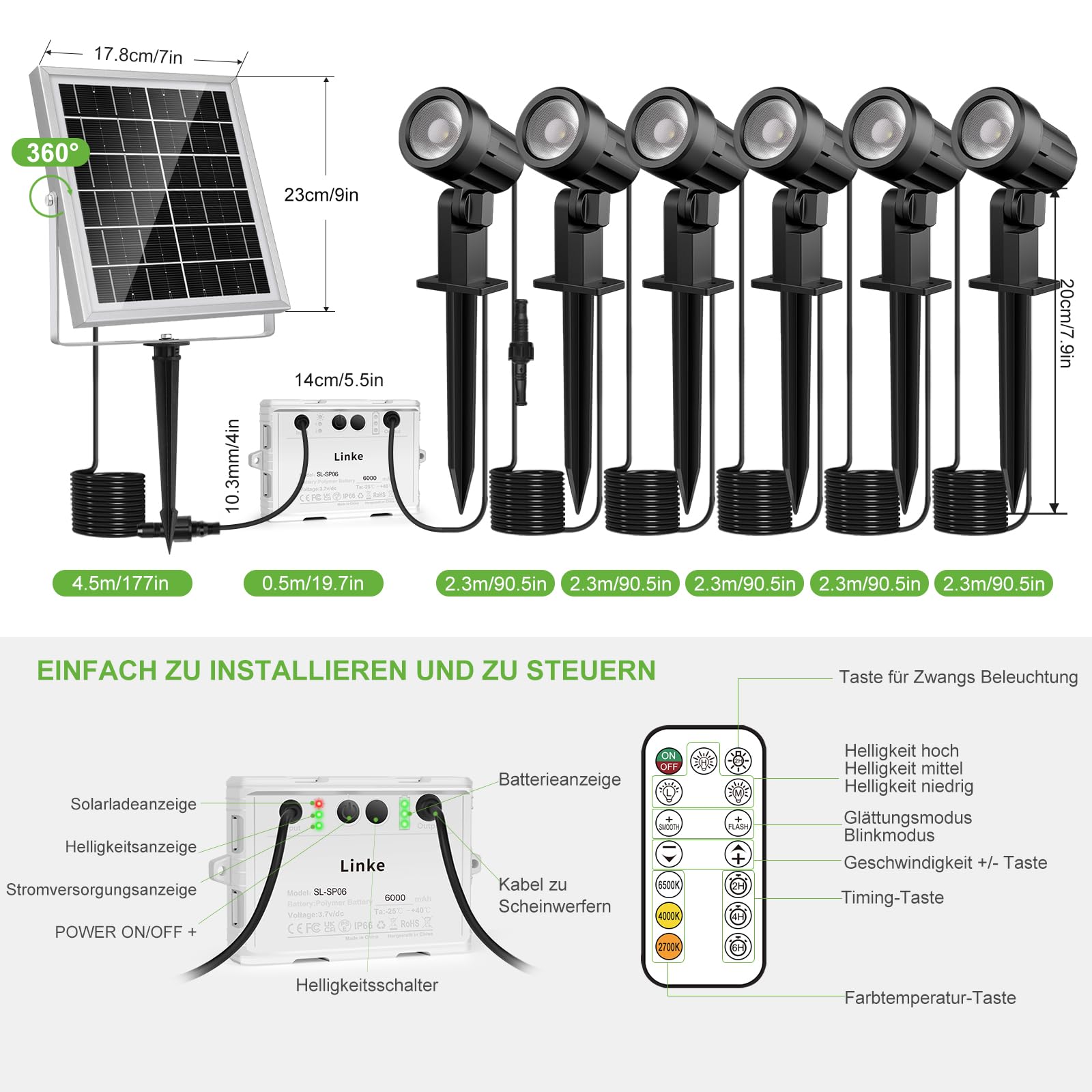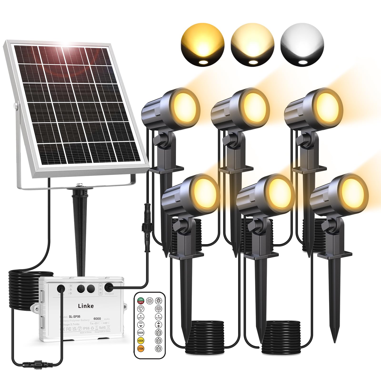 ["Upgraded Solar Spotlights: Left solar outdoor spotlights use a waterproof control box and are equipped with a remote control that can control the lamp in 360 degrees. Remote range up to 12 meters. Easily adjust the solar lights in the garden while lying on the sofa, making it smarter and more convenient. It also has the function to change and flash in different color temperatures (2700K~6500K), adding a festive atmosphere. Outdoor garden display light can show various power levels (30%, 70%, 100%), making it convenient for monitoring battery power at any time.","New improved optical design: The solar garden spotlights with ground stake have 3 color temperature modes including warm (2700K), warm white (4000K), cool light (6000K) to choose from. A solar garden light meets the needs of different atmospheres. Warm light is perfect for creating a romantic and beautiful warm white light in the garden or other open spaces. Cool light is ideal for lighting gardens, patios, lawns, paths.","3 brightness options: 6V/6W solar panel + 6 * 200LM spotlight solar, our solar garden spotlights for outdoor garden lighting outdoors waterproof can work for 20 hours in low brightness, 12 hours in medium brightness, and 8 hours in high brightness after fully charged, because it contains 6000mAh high-quality batteries with large capacity. High brightness mode: 200LM*6 lights=1200LM; Medium brightness mode: 140LM*6 lights=840LM; Low brightness mode: 100 LM*6 lights = 600LM.","Memory function and timing function: Left solar spotlights have extensive functions. Whether remote shutdown, turning off, or powering off, the solar garden light can remember the last light setting without wasting time on re-setting. You can turn off the light in 2-hour/4-hour/6-hour timing via the remote control, so you don't have to turn off the power before bedtime or after a party, which is convenient and saves electricity.","IP66 Waterproof and Dust-Proof: Left solar garden lights with outdoor special plugs, solar outdoor garden lights to connect solar panel and light, can withstand all kinds of weather throughout the year, solar lights for the garden improve the stability of outdoor lighting and long-term use.","Services: If you have any problem with our outdoor solar spotlights, please contact us directly without hesitation. We will provide you with a satisfactory solution."]