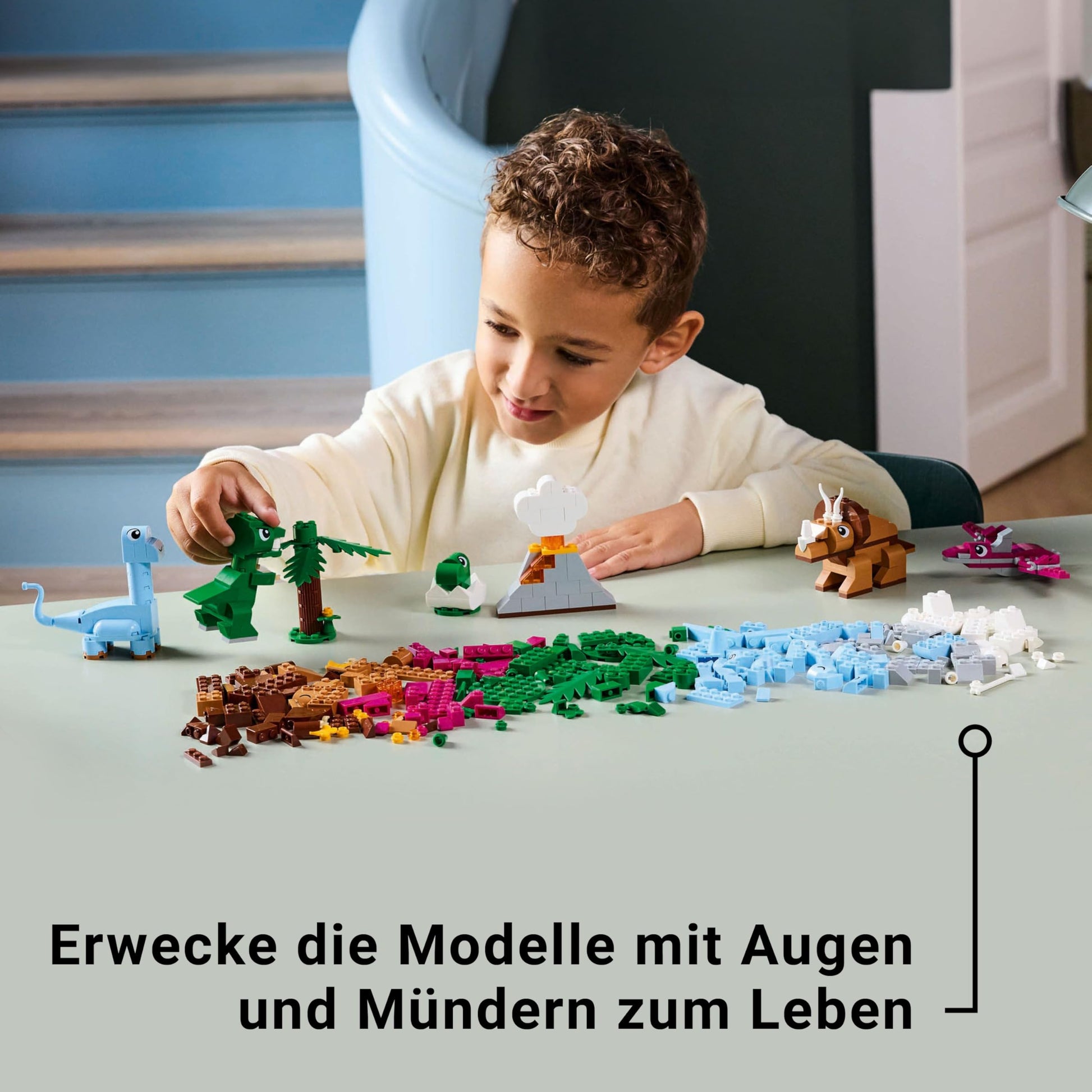 ["Dinosaur models: LEGO Classic Creative Dinosaurs is an incredibly versatile building and play set for boys and girls aged 5 and up and all fans of dinosaur toys", "Various LEGO bricks: Includes colorful bricks in different shapes as well as special parts like eyes, mouths, and decorative elements to make the toy dinosaurs even more imaginative", "Imaginative play experience: Children first build a T.Rex, a Pterodactyl, a Triceratops, a Brontosaurus, and a Baby T.Rex as well as a palm tree and a volcano, then create and customize their own dino figures", "Step-by-step instructions: An equally easy and intuitive building guide is included with this adventure toy and building set to help children develop creative building skills", "Dinosaurs for gifting: This creative toy with animal figures is a great birthday, Christmas, or surprise gift for dino-loving children aged 5 and up", "Even more fun: Also check out all the other (sold separately) LEGO Classic building toys to offer your child more imaginative play experiences", "Developmental building blocks: LEGO Classic playsets and dino toys provide countless inspiring ideas and allow parents to experience important developmental steps of their children in joint building projects"]