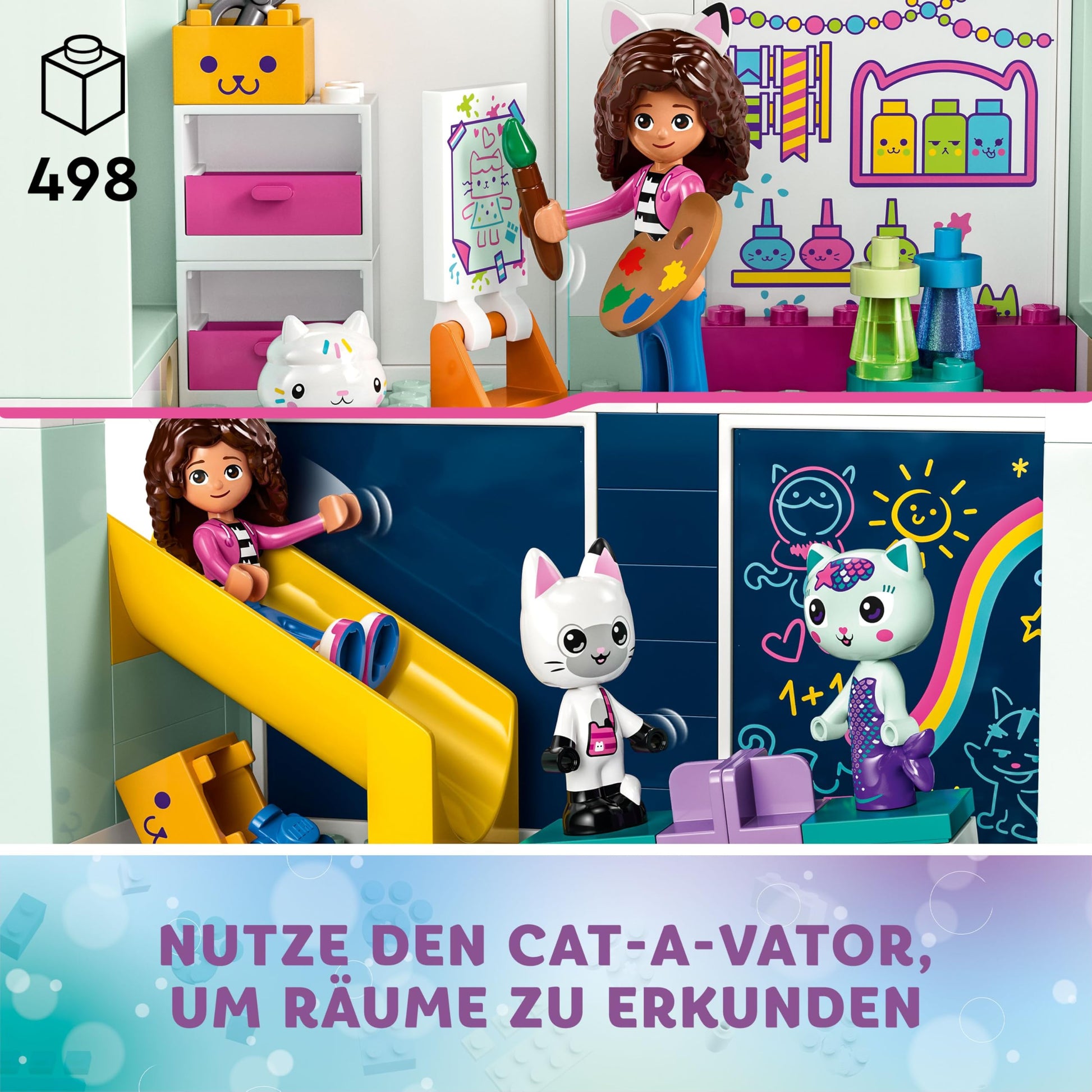 "Building set for little builders: With a starter building element and illustrated instructions, the cat-shaped dollhouse is easy to assemble; promotes playfully building skills and creativity",