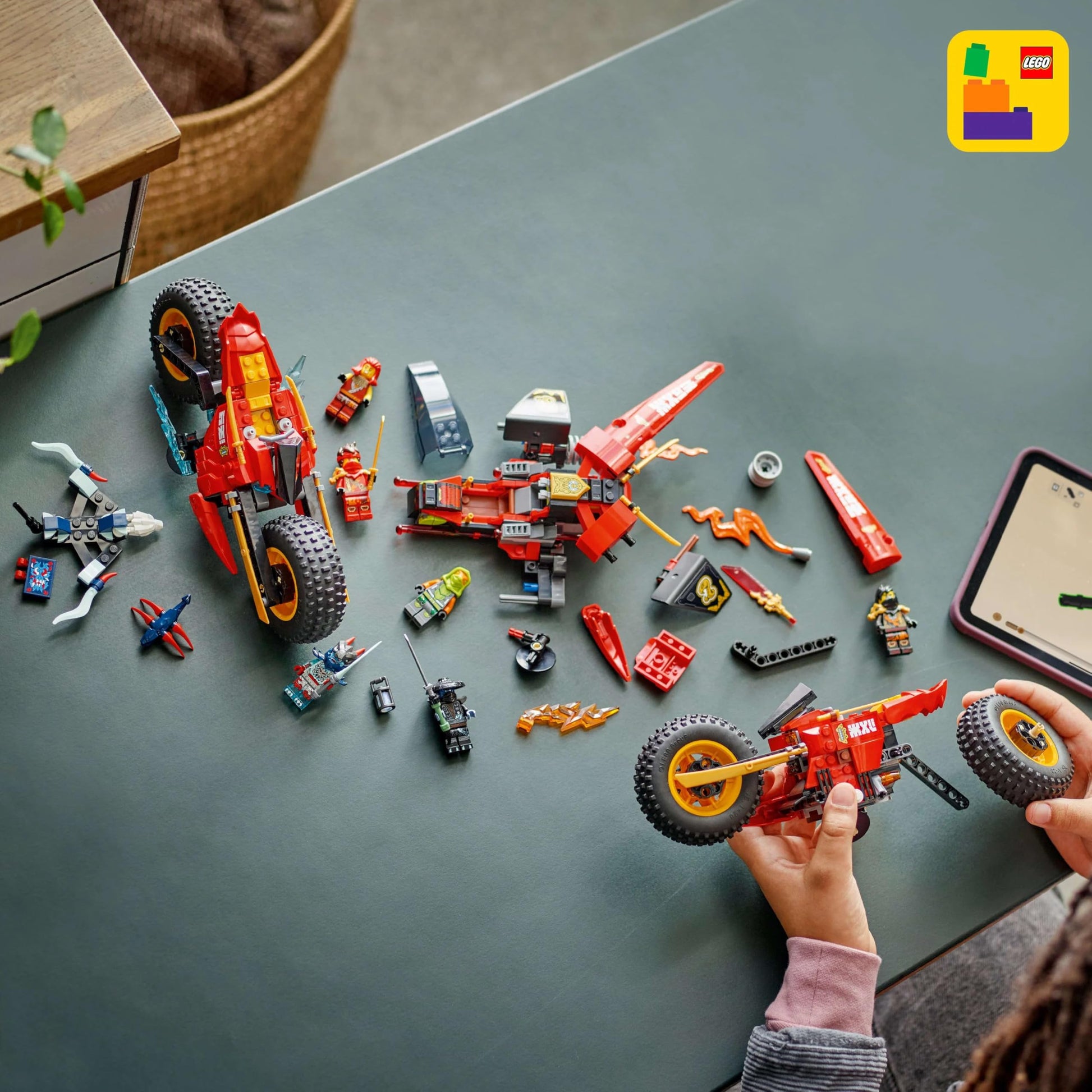 "Detachable Ninja Vehicles: The NINJAGO action speeder can be divided into 3 smaller vehicles to send Kai on his Ninja bike, Wyldfyre on her Ninja bike, and Frak's jet with 2 shooters"