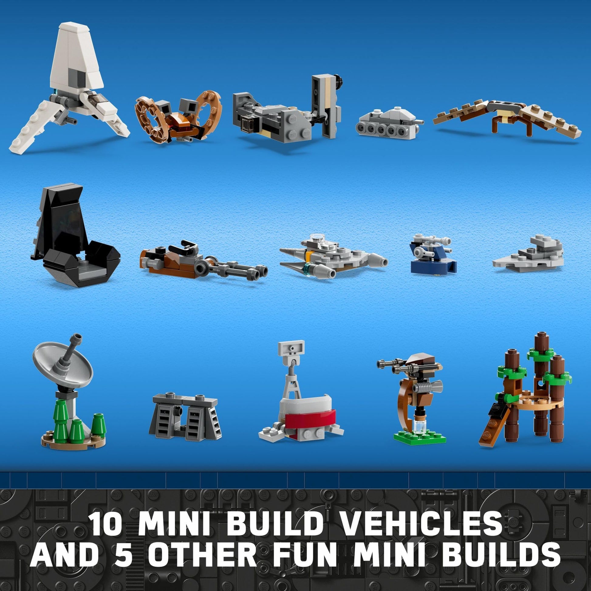 ["2023 LEGO Star Wars Advent Calendar (75366) - Build festive joy during the holiday season with a advent calendar featuring daily collectible surprises such as Star Wars characters, mini building toy vehicles, and accessories","9 Star Wars Characters - Includes Emperor Palpatine, an Ewok and a Pit Droid in holiday outfits, a Gonk Droid dressed as a reindeer, Omega with sled, a 212th Clone Trooper, B-1 Battle Droid, and Princess Leia","10 Mini Vehicle Building Toys - The Justifier, The Mandalorian's N-1 Starfighter, a Turbo Tank, STAP Speeder, AAT, Imperial Shuttle, AT-ST, Speeder Bike, Imperial Star Destroyer, and Ewok Glider","5 Additional Mini Builds - Clone Command Center, Ewok Village, Endor Bunker, Endor Shield Protector, and Emperor's Throne","Creative Fun - Includes characters and builds to discover new experiences and Star Wars: Return of the Jedi, Star Wars: The Clone Wars, and Star Wars: The Bad Batch stories and for use with other LEGO Star Wars sets.Holiday Countdown Gift Idea - Give this 320-piece LEGO Star Wars Advent Calendar as a holiday gift for children ages 6 and up."]