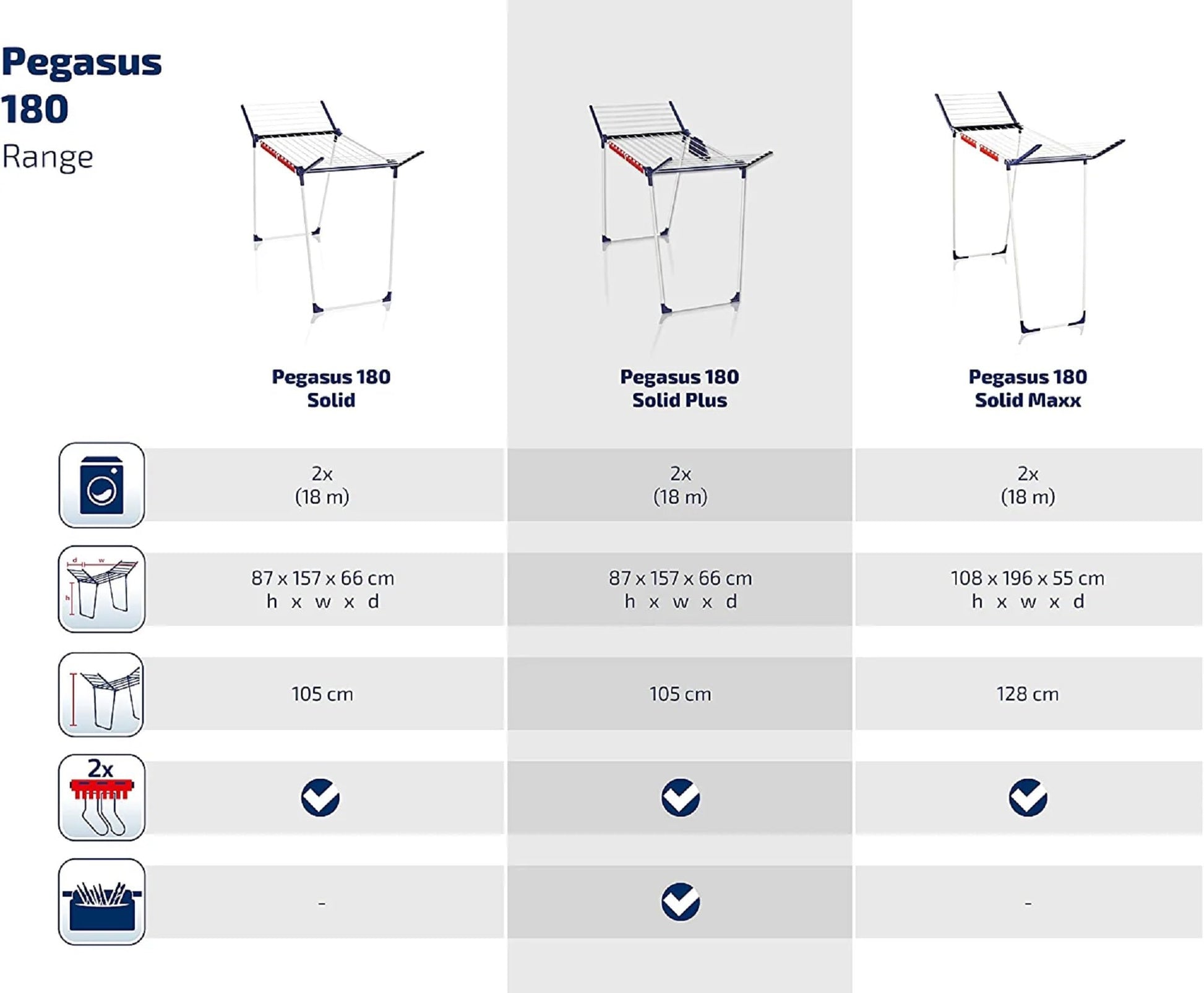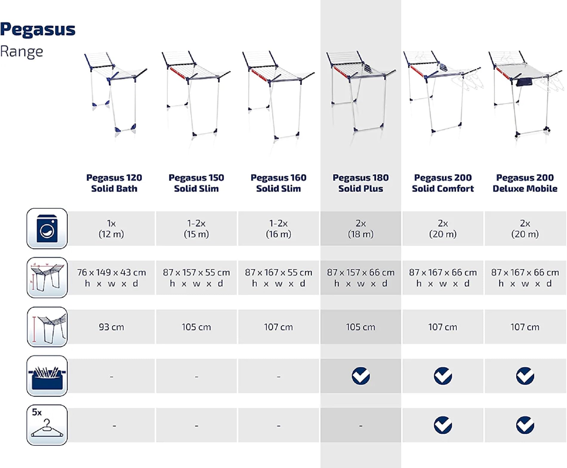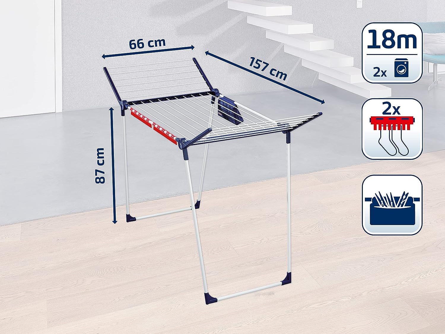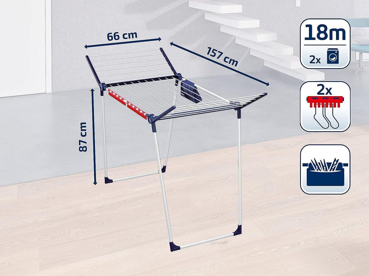 ["Stable Design - The Leifheit clothes horse offers a stable base with its parallel legs and 18 m drying length when fully unfolded", "Smart Design - The collapsible drying rack has 105 cm high wings, ideal for hanging longer items like pants or towels", "Space-saving & rustproof - The clothes rack can be stored compactly when not in use. The drying rods are rust-resistant thanks to a special powder coating", "Great Extra - The laundry hanger comes with two small item holders for hanging small items without clips", "Save energy in the household - natural drying without electricity with the Leifheit clothes horse is not only energy-efficient but also eco-friendly and gentle on clothes", "Package Contents - Leifheit Pegasus 180 Solid Plus clothes horse, winged clothes rack with clip bag & 2 small item holders, 18m drying length, 105cm high wings, blue/white, Made in Europe, Item No. 81510"]