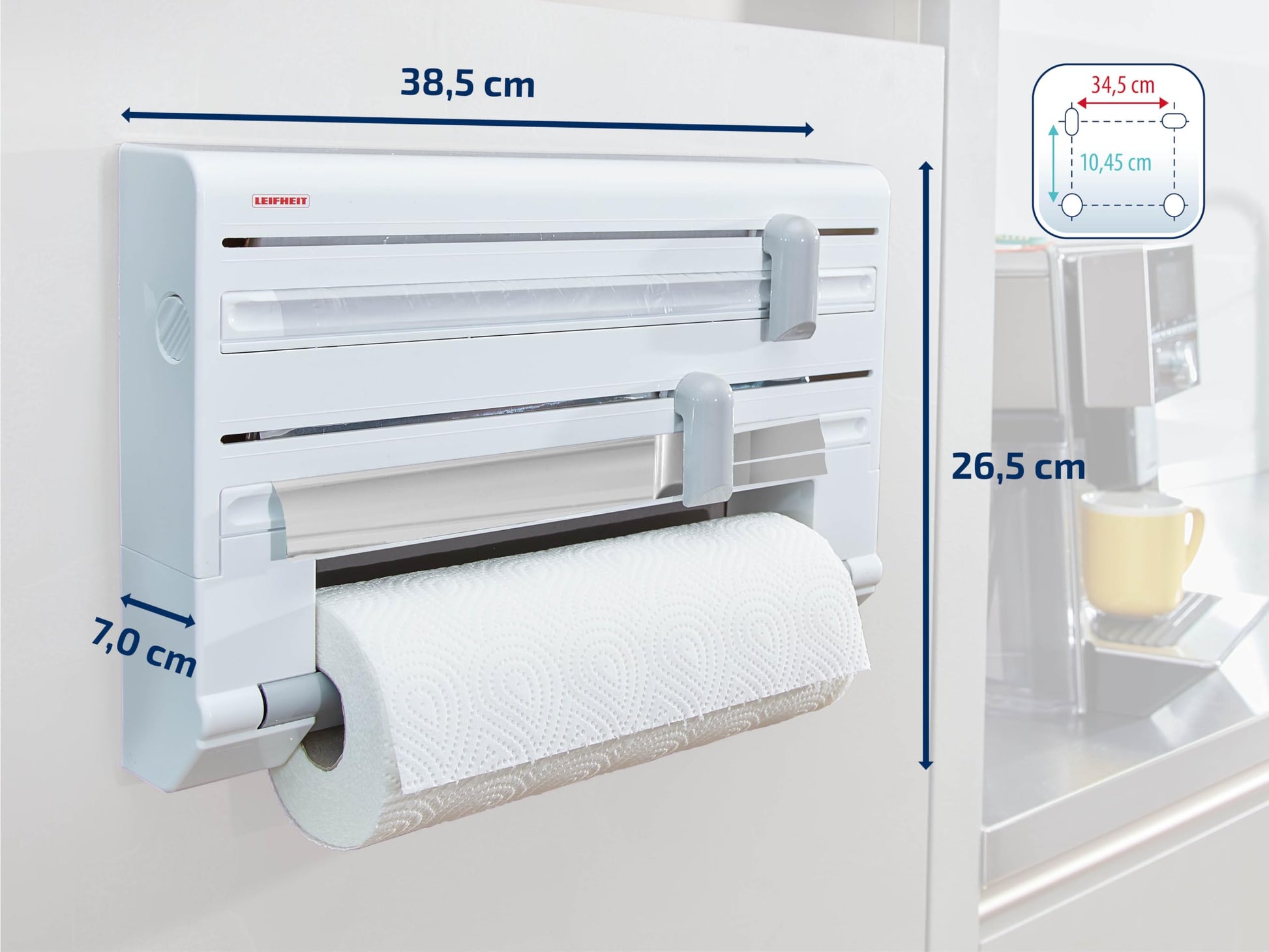Leifheit Wall-Mounted Paper Towel Holder Parat ComfortLine Series for 3 rolls, clean cut edges with practical cutting blade, kitchen roll holder with foil cutter ensures convenient foil ends.