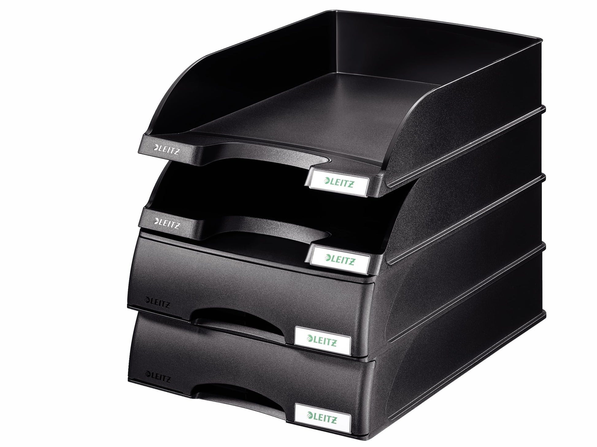 ["Universal Document Storage: Premium tray set with matte surface, Ideal for organizing A4 documents, magazines, and folders in the office, back office, home office, or school","Extremely durable construction: Stable when fully loaded thanks to sturdy plastic material, 9 lb carrying capacity of the letter tray even at the highest level; Front slant for easy access to documents","Space-saving design: Larger capacity of the letter trays than the market standard due to higher side walls, Inner dimensions: 9.5 x 2.4 x 13 inches; Stackable vertically or offset for document organization","Unique filing system: \"Press & Click\" connection system offers the option to build the drawer included in the set with multiple drawers into a large drawer box or combinable with Leitz Plus Letter Trays","Data security in the office: Protected desk compartment for confidential, important documents and data e.g. in HR departments; Includes attachable labeling tag; Inner dimensions: 9.2 x 2.1 x 12.8 inches","Flexible filing system: The letter tray and drawers included in the set are combinable with other products from the Leitz Plus series, the Standard, Slim, & Jumbo letter trays","Package contents: 2 x Leitz Plus Standard Letter Tray, A4, Polystyrene (PS), Dimensions (WxHxD): 10 x 2.8 x 14 inches, Color: Black, Plus series, 52270095 + 1 x Leitz Letter Tray Drawer, A4, Dimensions (WxHxD): 10 x 2.8 x 14.8 inches, Color: Black, Plus series, 52190095; Design your own labeling tag with Leitz Easyprint"]